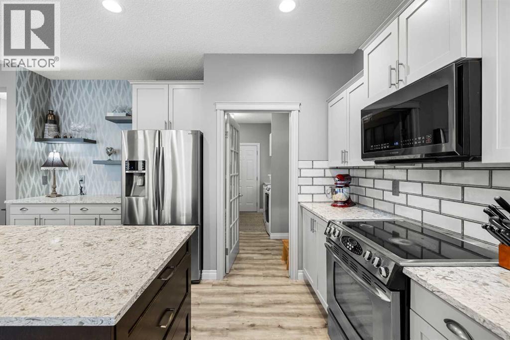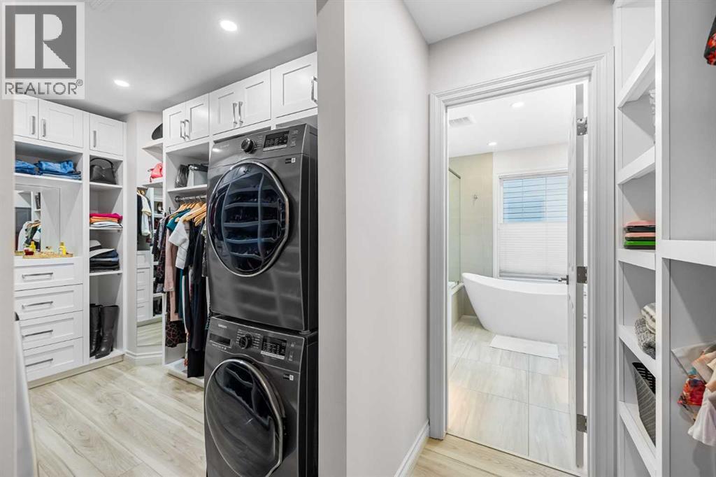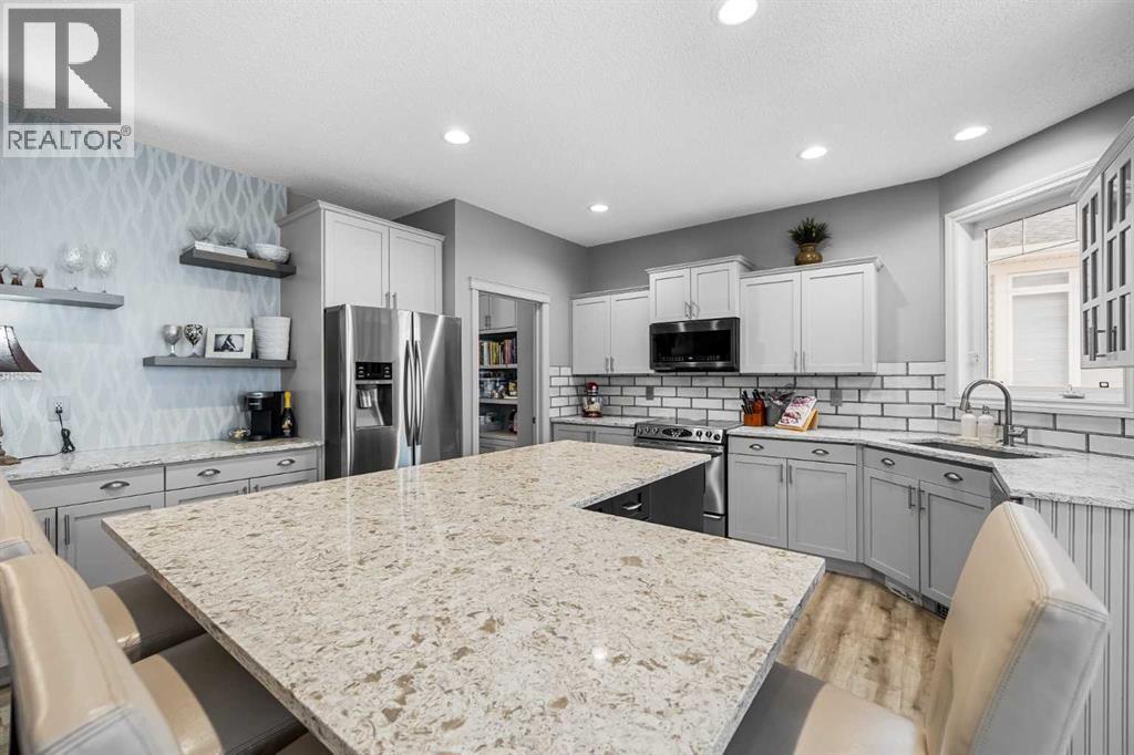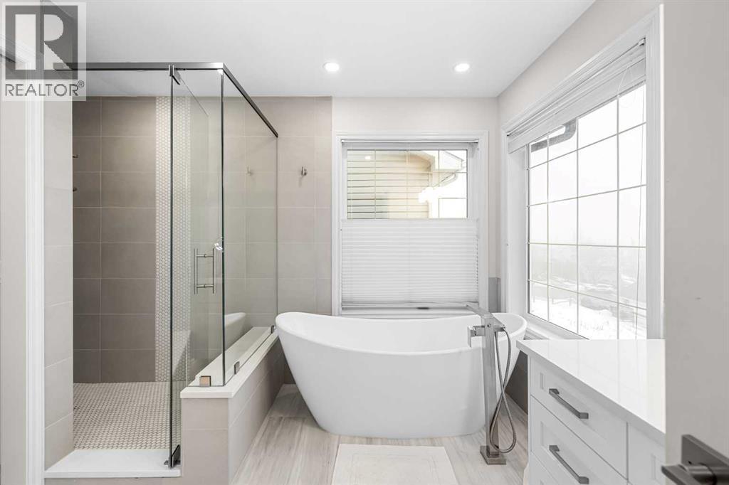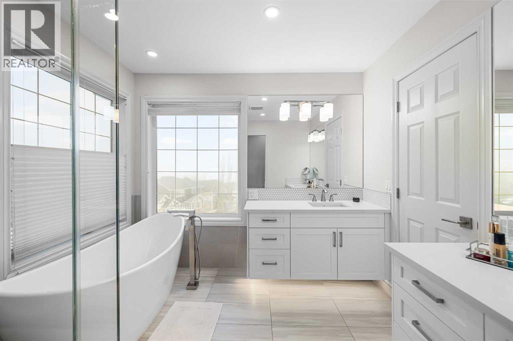 Welcome to this exceptional family home in sought-after Hansen Ranch, perfectly positioned backing onto a beautiful ravine green space with a sun-drenched south-facing backyard. This fully finished two-storey walkout boasting over 3,100 sqft of developed living space offers the perfect blend of luxury, functionality & an unbeatable natural setting in NW Calgary. Extensively renovated in 2021, this home showcases high-end finishes & thoughtful design throughout. Luxury vinyl plank flooring flows seamlessly across every level, complemented by quartz countertops throughout. Large windows flood the space with natural light & beautifully frame ravine views, creating a bright, inviting atmosphere. The main floor is elegant yet practical. A stunning stone gas fireplace anchors the living room, adding warmth & architectural presence. The chef-inspired kitchen features stainless steel appliances, a large center island perfect for gathering, a spacious dining nook overlooking the green space & a custom walkthrough pantry offering elevated storage & everyday convenience. A dedicated main floor office makes working from home effortless, while the main floor laundry/mudroom enhances the functional layout. Hunter Douglas blinds provide style & privacy throughout. Up the wide staircase with striking railing you’ll find three generous bedrooms, including a dreamy primary retreat. The spa-inspired ensuite offers dual sinks, a stand-alone soaker tub, gorgeous rain shower & a custom walk-in closet complete with its own stacked washer & dryer- a luxurious yet practical touch. Undercabinet lighting in the upstairs bathrooms adds a soft glow. Two additional great-sized bedrooms with custom closets & a 4 pc bathroom complete the upper level. The fully finished walkout basement expands your living space with a large recreation room with a beautiful corner gas fireplace that provides amazing heat to the space, fourth bedroom & full guest bathroom-ideal for visitors, teens or extended family -plus direct access to the peaceful landscaped backyard & ravine beyond. Step outside to your massive composite deck oasis with glass railing, custom stair lighting & a huge storage shed tucked neatly underneath. With no rear neighbors & direct access to green space, this south-facing yard offers privacy, sunshine & stunning natural views year-round. Additional highlights include a double attached garage, professionally landscaped backyard with a lower patio, underground irrigation, air conditioning, hot water on demand & a newer roof (high quality DKO Dynasty Shingle) for peace of mind. Close access to Stoney Trail with convenient proximity to grocery stores, amenities, restaurants, shopping & schools. Elegant & move-in ready, this is a rare opportunity to own a beautifully renovated walkout in one of northwest Calgary’s most established family communities. Lovingly cared for with pride of ownership shown throughout. (id:6769)