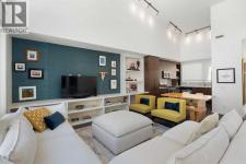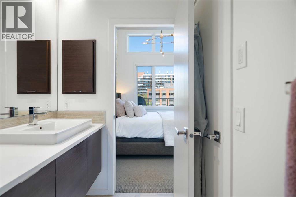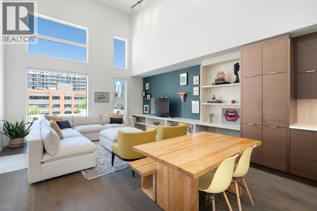 Welcome to The Block, one of Calgary’s most architecturally distinctive communities just off vibrant 17th Avenue. Designed by Sturgess Architecture and built by Avi Urban, this boutique development is known for its rare private courtyard concept — each residence opens directly to the outdoors, creating a sense of community, privacy, and independence that’s truly unmatched in the downtown core.This top-floor penthouse loft is one of the most desirable suites in the complex. Soaring 14’ vaulted ceilings and hardwood floors throughout create an airy, dramatic living space, while massive windows flood the home with natural light. A custom wall of built-ins anchors the living room with both style and functionality. The sleek kitchen features stainless steel appliances, lacquered cabinetry, and generous storage — perfect for both everyday living and entertaining. Step out onto your private deck with city views, complete with gas access for easy BBQ evenings. The spacious primary bedroom offers large windows and convenient access to a beautifully appointed bathroom with walk-in glass shower and modern vanity. The second bedroom is thoughtfully designed with a full wall of built-in storage, making it ideal for guests, a home office, or both. Complete with titled parking, additional storage, built-in laundry, and air conditioning, this is effortless urban living at its finest. Now offered at a significantly improved price, this penthouse represents outstanding value in one of Calgary’s most dynamic inner-city locations. Don’t miss your opportunity to experience The Block at its very best. (id:6769)