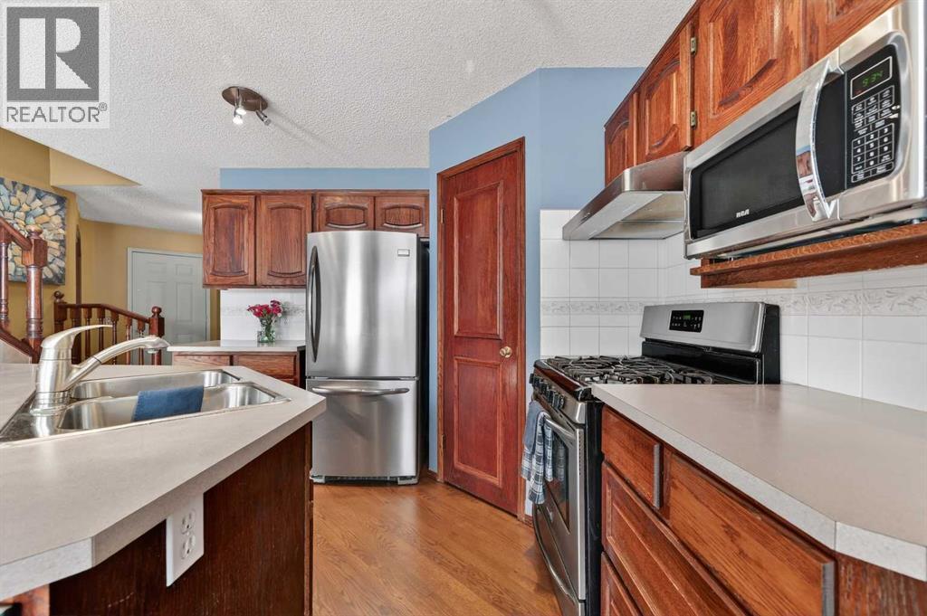 OPEN HOUSE SAT MARCH 7 1:00-4:00. Welcome to this wonderful family home tucked away on a quiet street with 2 Playgrounds just steps away. This home has 1,910 ft2 of developed living space including 4 bedrooms, all upstairs! As you enter in the front door you are greeted by an open front foyer that is flanked by an office/family room on one side and the laundry room and powder room on the other. Rich hardwood flooring flows throughout the main level from the front door to the kitchen, dining area and living room. Perfect layout for entertaining and enjoying family time. The kitchen has stainless steel gas stove, refrigerator and dishwasher and a large walk in pantry. The island has plenty of cupboards and counter space for preparing food and storing the appliances and extra dishes. The newly painted living room is flooded with natural light and fresh air from the large venting windows. The wood fireplace with mantle comes with a gas log lighter. The dining area can accommodate a large family sized table and is conveniently located next to the door to back deck and BBQ area. Upstairs you will be thrilled to find 4 bedrooms. The primary suite is huge with an extended room boasting a downtown Calgary view! This space is perfect for an exercise area or quiet space to enjoy a book. The bedroom will fit all your king sized furniture and has a walk in closet and 4 piece ensuite with a jetted bathtub, shower, water closet and sink vanity. The other three bedrooms are all a generous sizes with big closets and share a 4 piece bathroom. The unfinished basement is awaiting your development ideas, if you need extra finished space. This property has a large fenced, beautifully landscaped yard with gardens and a deck with a pergola that is great in the summer and has a cover for use in the winter also! The garden shed is perfect for storing your outdoor tools. Recent updates include; ALL POLY B HAS BEEN REPLACED WITH PEX PLUMBING - 2026, DISHWASHER - 2025, FENCE - 2024, DECK - 2023, GAZEBO - 2023, ALL WINDOWS - 2023, ASPHALT SHINGLES - 2016 (id:6769)