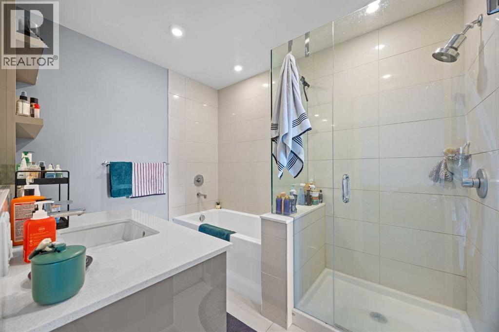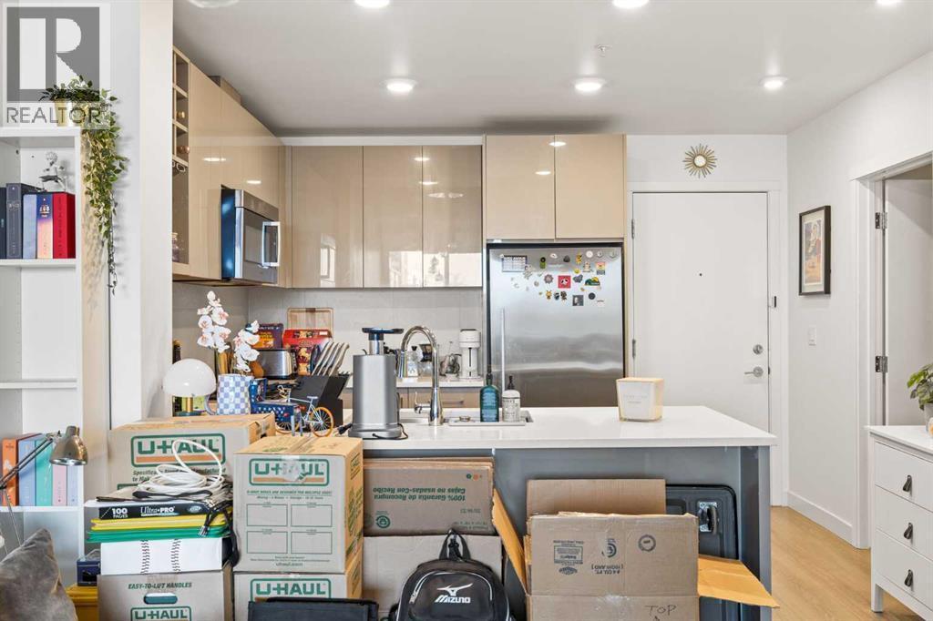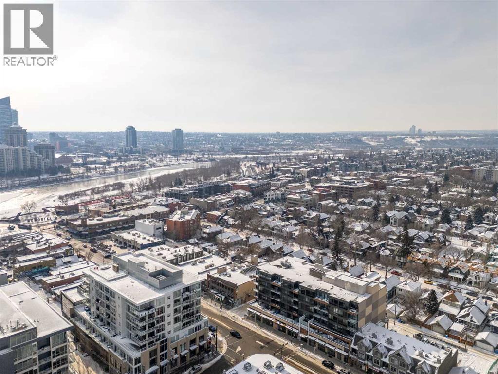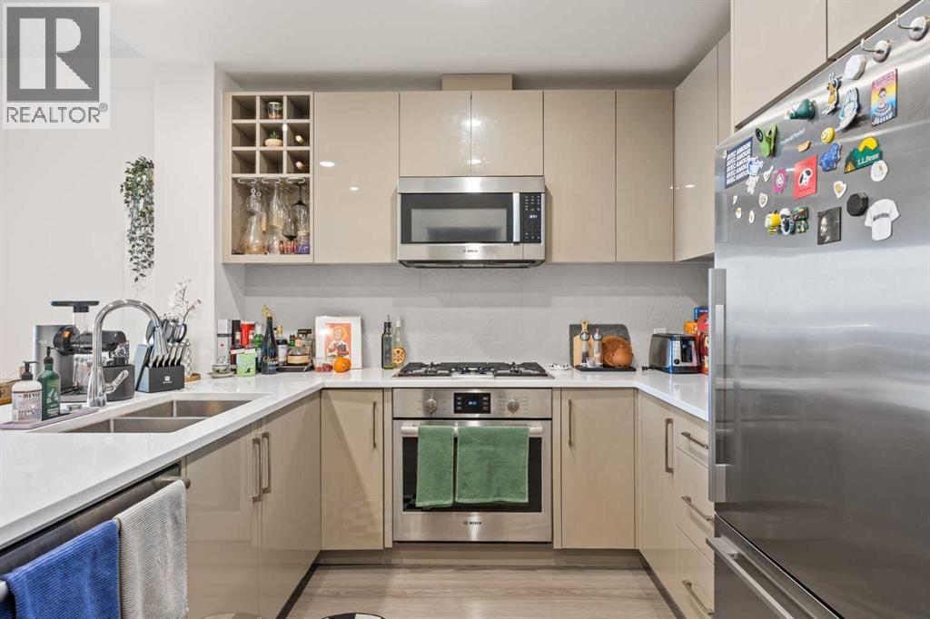Welcome to urban living at its finest in The Kensington, ideally located in the vibrant community of Hillhurst. This beautifully appointed 1-bedroom, 1-bathroom unit showcases modern finishes and an open-concept layout designed for both comfort and functionality. The stunning U-shaped kitchen features high-gloss cabinetry, excellent counter space, a built-in wine rack, and premium stainless steel Bosch appliances, including a gas stove, perfect for those who love to cook and entertain. The kitchen seamlessly opens to the bright living/dining area, offering flexibility for adding a home office setup or a sunny reading nook. Step outside to your spacious private south facing balcony, complete with a convenient BBQ gas line, ideal for entertaining or relaxing evenings at home. The generous primary bedroom offers a large walk-through closet with thoughtfully designed shelving for maximum organization and direct access to the elegant 4-piece bathroom. Enjoy luxury touches including a deep soaker tub, glass surround stand up shower, large vanity with ample storage, built-in shelving, and a cheater door providing convenient access from the main living space. Additional highlights include a dedicated laundry room near the entrance with side by side washer and dryer with extra storage space and an additional front closet area. Central air conditioning ensures year round comfort and this unit also comes with one TITLED underground parking stall and an assigned storage locker, an added bonus that is priceless with condo living. Additionally the building also offers a residents car wash and bike storage! Residents will love the unbeatable location with retail amenities right on the main floor, including Orange Theory Fitness and a café, plus just a 5-minute walk to Sunnyside LRT station. Enjoy quick access to the Bow River pathways, downtown core, and the countless shops and restaurants that make Kensington one of Calgary’s most sought-after neighbourhoods. This is a rare oppor tunity to own a sophisticated home that perfectly blends luxury, convenience, and that unbeatable inner city lifestyle. (id:6769)