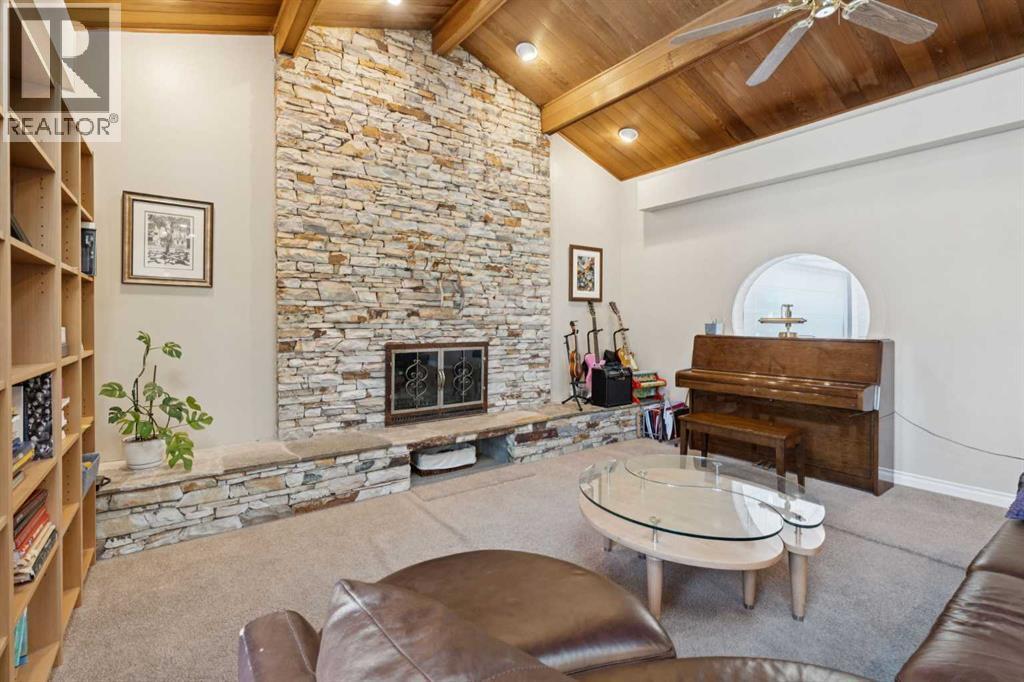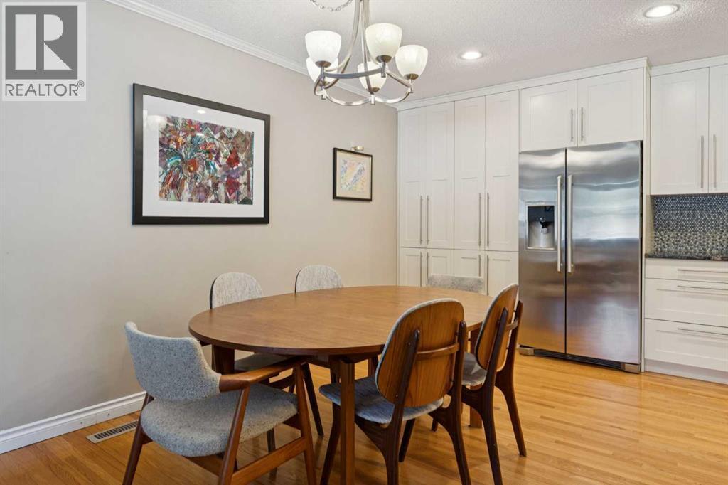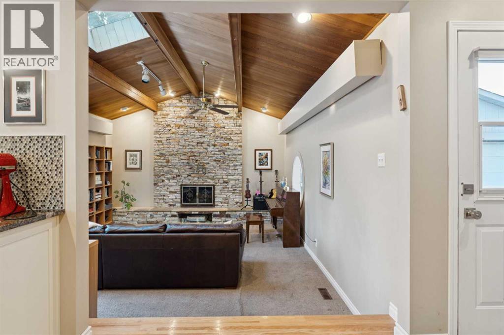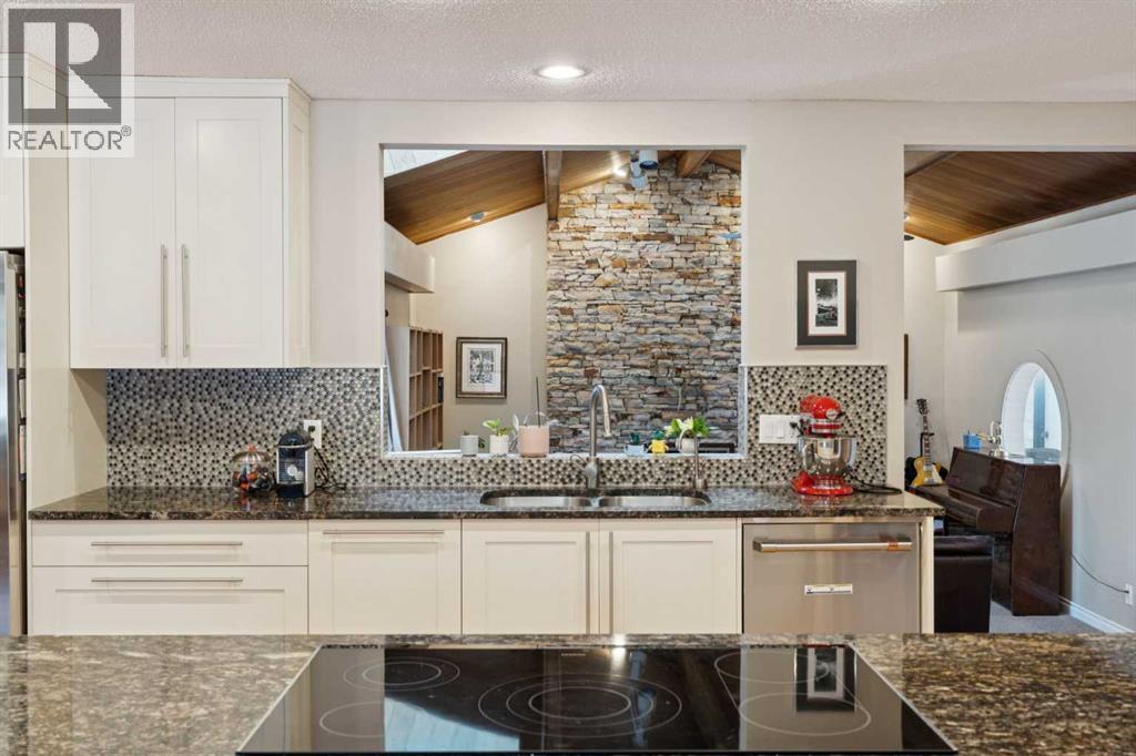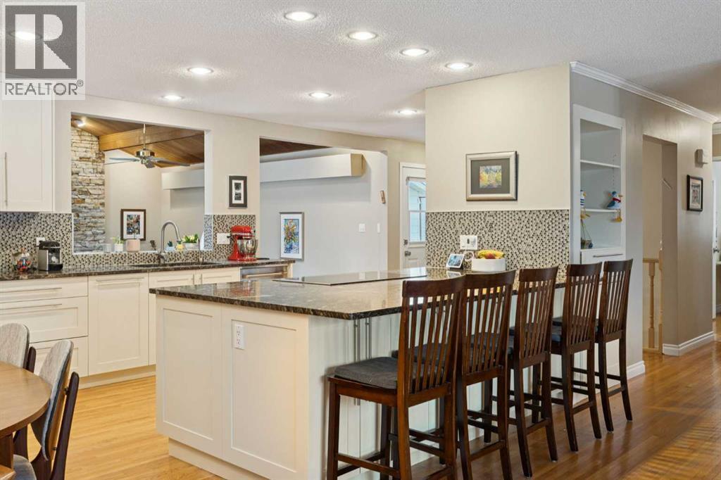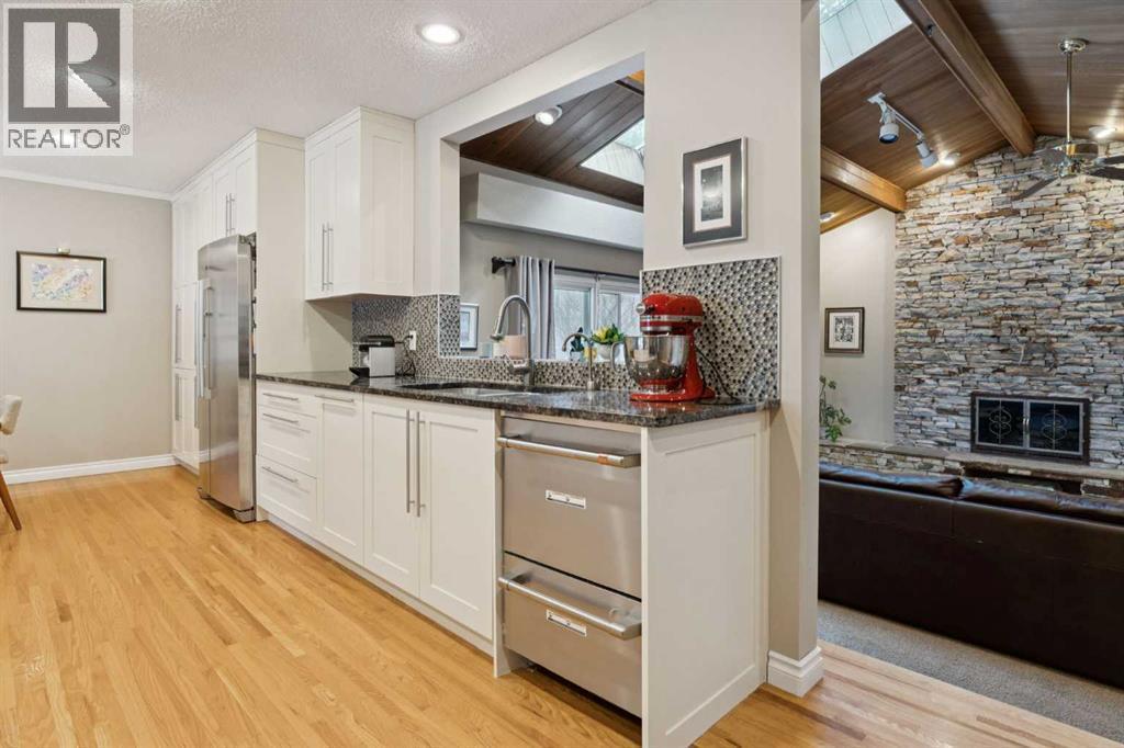 RARE FIND! Beautifully maintained and upgraded, this 3+2 bedroom bungalow offers 2,919 SF of developed living space featuring a 315 SF vaulted family room addition with open-beam ceiling and a striking floor-to-ceiling stone fireplace. A tremendous benefit to this reno was the ability to expand in to a custom kitchen (2010) that is absolutely stunning, showcasing an abundance of custom cabinetry, stone counters, breakfast bar and stainless steel appliances including double ovens making this kitchen a Chef’s dream. Additional highlights include hardwood floors which run through the main living areas and bedrooms, updated main bathroom (2017), modern interior finishing and large upgraded windows. The basement is finished with two additional bedrooms, a newer 4 piece bathroom, hobby/rec space, storage and laundry. Major exterior and mechanical updates include Hardie board siding (2019), new roof on both the house and garage (2019), central A/C (2018), hot water tank (2016), R40 insulation, and 90% window replacement. Situated on a large pie-shaped lot with a detached, oversized double garage (23'x21') and walking distance to Louis Riel School, community center, parks, and pathways—this is an exceptional opportunity to own a turnkey home in one of Calgary’s most established, family-friendly neighborhoods. (id:6769)