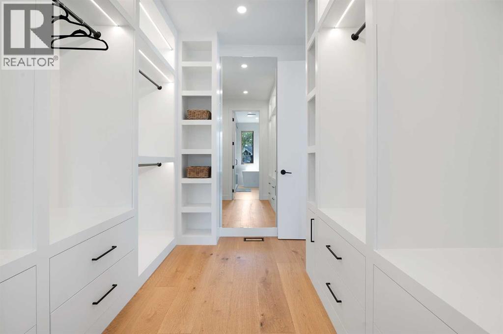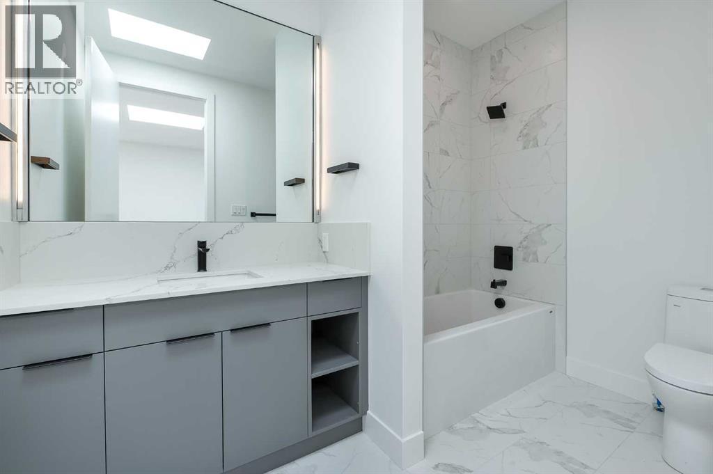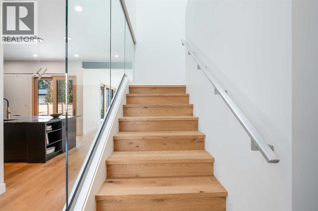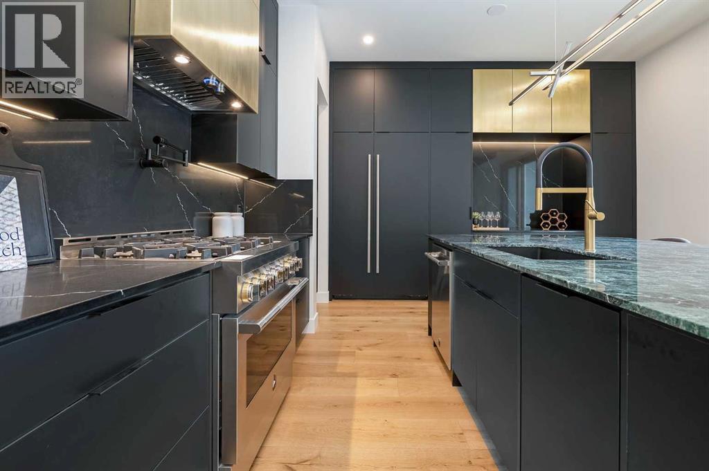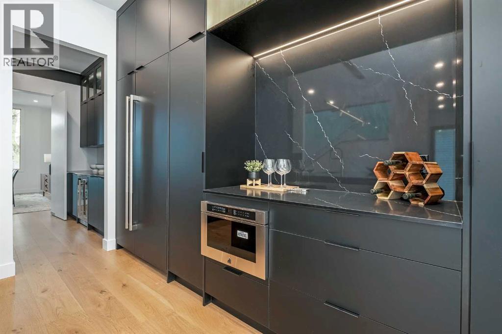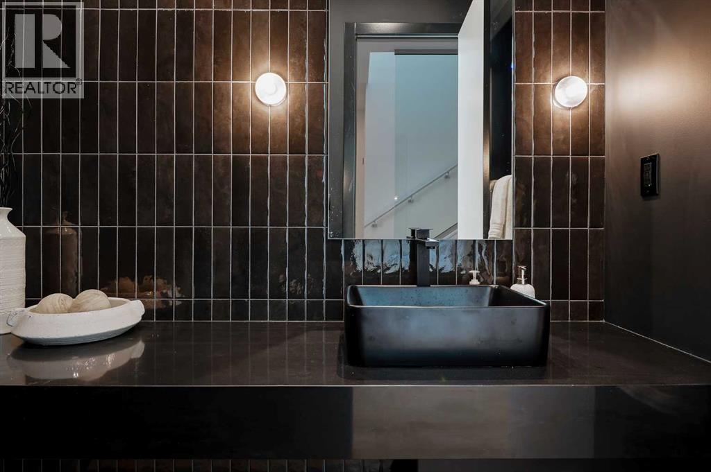Steps from Confederation Park, this striking architect-designed residence in Mount Pleasant offers over 4,500 sq ft of meticulously crafted living space, combining thoughtful design with exceptional inner-city livability. Conceived and executed by an award-winning design studio behind several notable architectural and public art projects, the home reflects a rare level of intention, craftsmanship, and material integrity seldom seen in infill construction. Its sculptural façade, engineered to subtly respond to Calgary’s Chinook winds and enhanced with programmable architectural lighting, creates a dynamic street presence that shifts beautifully from day to night. A welcoming concrete patio and thoughtfully curated landscaping establish an inviting sense of arrival. Inside, the main level unfolds in a bright, open layout designed for both refined entertaining and comfortable everyday living. Wide-plank hardwood floors, soaring ceilings, and expansive windows create strong visual connections throughout the home. The front dining area offers an elegant setting for hosting, while the chef-inspired kitchen features an oversized Verde Alpi marble island, custom cabinetry with brass accents, JennAir appliances, and a discreet butler’s pantry with direct access to the dining room. At the rear, the living room is anchored by a dramatic feature wall clad in imported large-format tile, complemented by integrated shelving with mood lighting and a smart fireplace. Large glass doors open to the expansive rear deck and sunny south-facing yard, creating seamless indoor–outdoor flow. A private office off the foyer provides a quiet and refined work-from-home setting. The upper level hosts four spacious bedrooms thoughtfully arranged for family living. The primary retreat feels like a private sanctuary, offering access to a serene balcony, generous walk-in closet, and a spa-inspired ensuite with freestanding soaker tub, oversized glass shower, and dual vanities. A second bedroom enjoys its own ensuite, while the remaining bedrooms offer flexibility for children or guests. A well-appointed laundry room with built-in storage completes this level. The fully developed lower level extends the home’s living and entertainment spaces with a large family/media area, full bath, and two flexible rooms ideal for a gym, studio, or guest accommodation. Comfort-focused and future-ready features include central A/C, speaker rough-ins, and a full elevator rough-in connecting all three levels. Outdoor living is equally impressive with a sunny south-facing backyard, expansive deck, custom fencing, and architectural lighting. A rare, insulated triple detached garage with EV charger adds exceptional convenience and storage. Perfectly positioned steps from Confederation Park, and close to SAIT, the U of C, schools, restaurants, shopping, and transit, this remarkable home offers a rare opportunity to own an architect-designed residence where design, craftsmanship, and everyday livability converge. (id:6769)