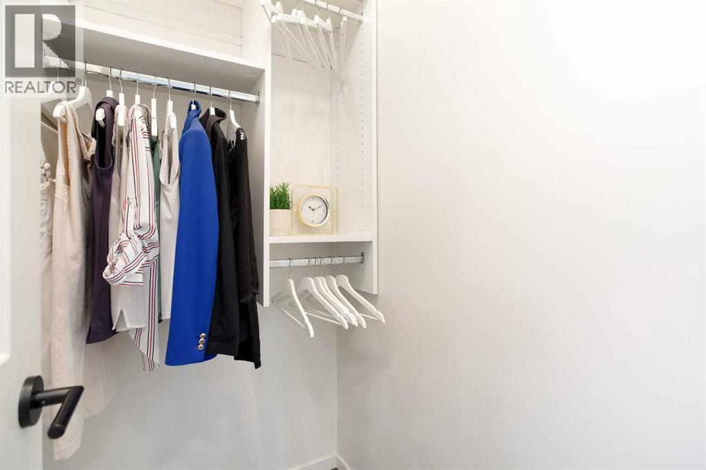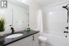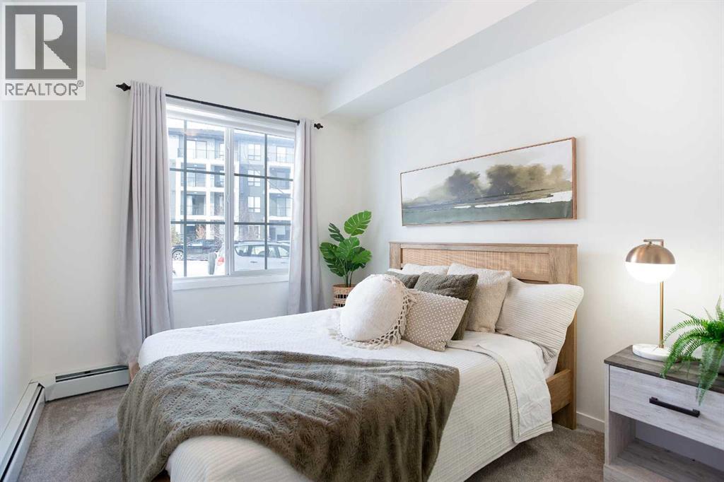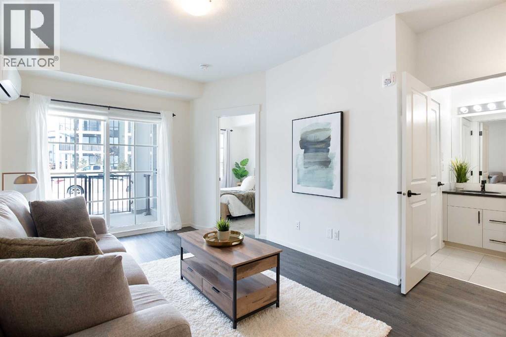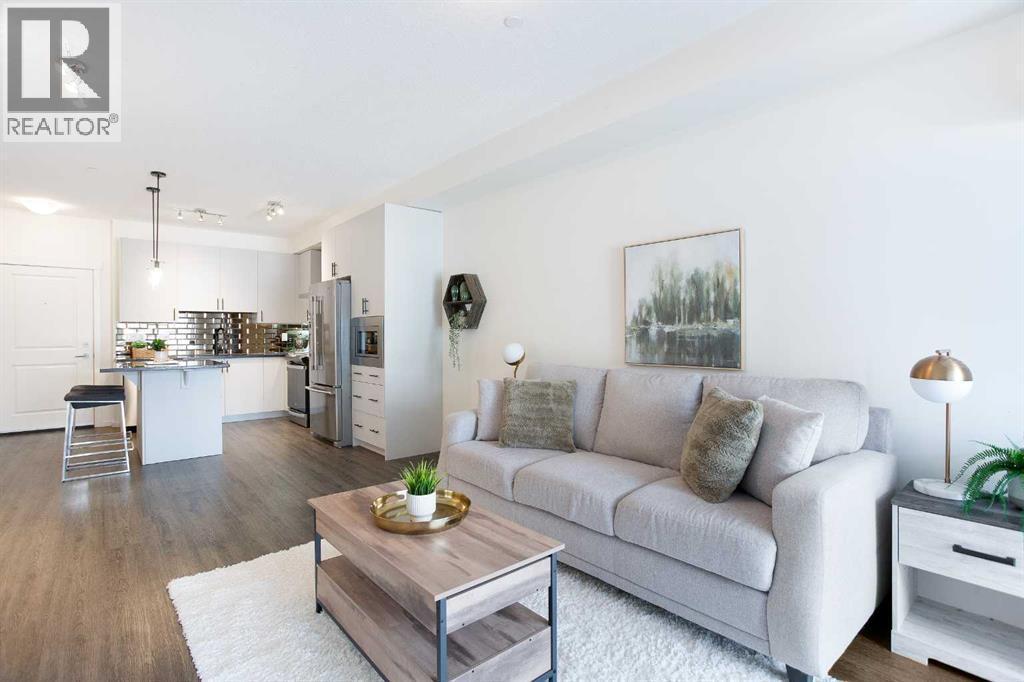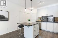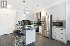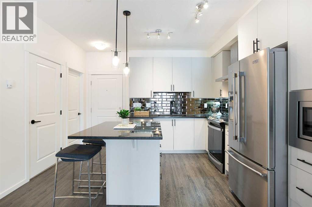 Welcome to this 1 bedroom former showhome unit that truly shows pride of ownership.The open layout features a spacious kitchen with an upgraded island, backsplash, chimney hood fan, built-in microwave, stainless steel appliances, and stone countertops. Black plumbing fixtures and door hardware give it a clean, modern feel throughout.You’ll appreciate the large walk-in entry closet, in-suite laundry, 9-foot ceilings, vinyl plank flooring, upgraded tile, and the added bonus of a Daikin air conditioner for year round comfort.The walk out patio is generously sized and includes a BBQ gas line, perfect for relaxing or entertaining. The building is pet-friendly, and the easy walk-out access makes it especially convenient for dog owners.This home has been exceptionally well maintained and also comes with a titled underground parking stall and assigned storage locker.All of this in a fantastic location within walking distance to shopping, restaurants, and everyday amenities. A great opportunity you won’t want to miss. (id:6769)