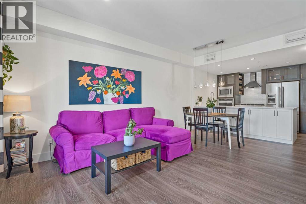 Welcome to The Riviera in Parkdale, offering refined inner-city living in one of Calgary’s most desirable riverfront communities. Ideally located directly across from the Bow River and its extensive pathway system, this location provides easy access to Kensington, Downtown, Foothills Hospital, and Alberta Children’s Hospital.This south-facing main floor 1 bedroom + den unit offers over 665 sq ft of thoughtfully designed living space with 9’ ceilings and large windows that fill the home with natural light. The modern kitchen features quartz countertops, quality appliances, a pull-out pantry, and a large island, opening seamlessly to the bright living area.Additional features include laminate flooring, in-suite laundry, central A/C, in-floor heating, central water softener, and extensive soundproofing. Enjoy the spacious south-facing patio with pleasant river valley views. The primary bedroom is bright and comfortable with convenient access to the 4-piece bath complete with a soaker tub.The Georgian-inspired Riviera building showcases a stunning lobby with 20’ coffered ceilings and elegant chandeliers, and the unit includes titled underground parking and an assigned storage locker.An excellent opportunity for professionals and investors seeking a premium location close to hospitals, downtown, shops, restaurants, and Calgary’s beautiful river pathways. Contact your favourite realtor today to book a showing! (id:6769)
