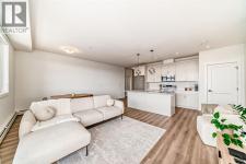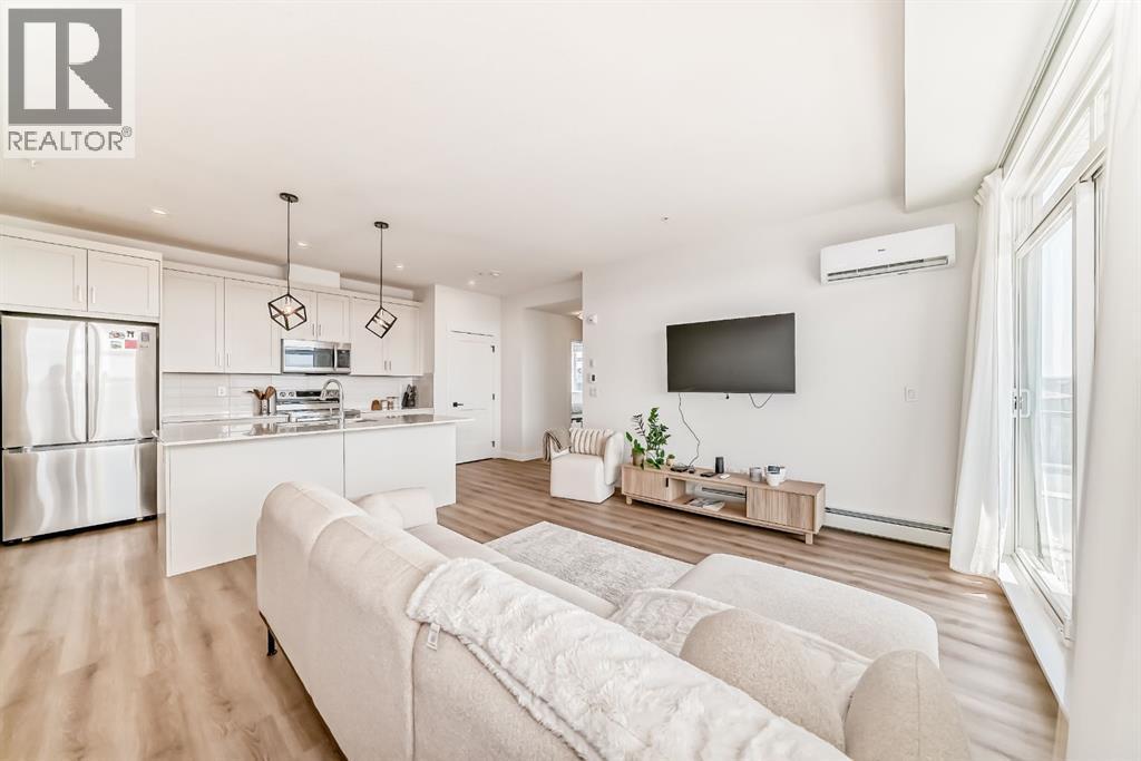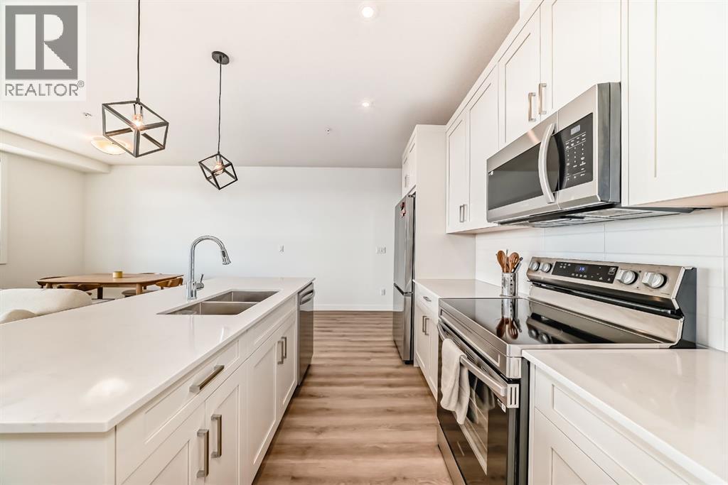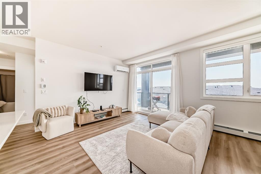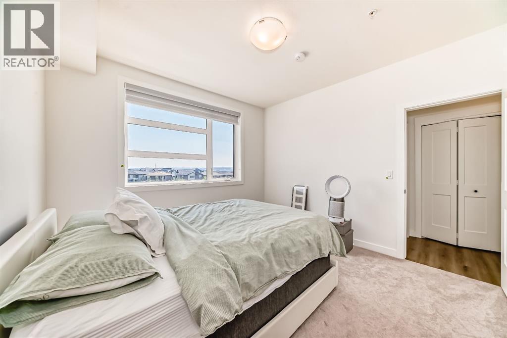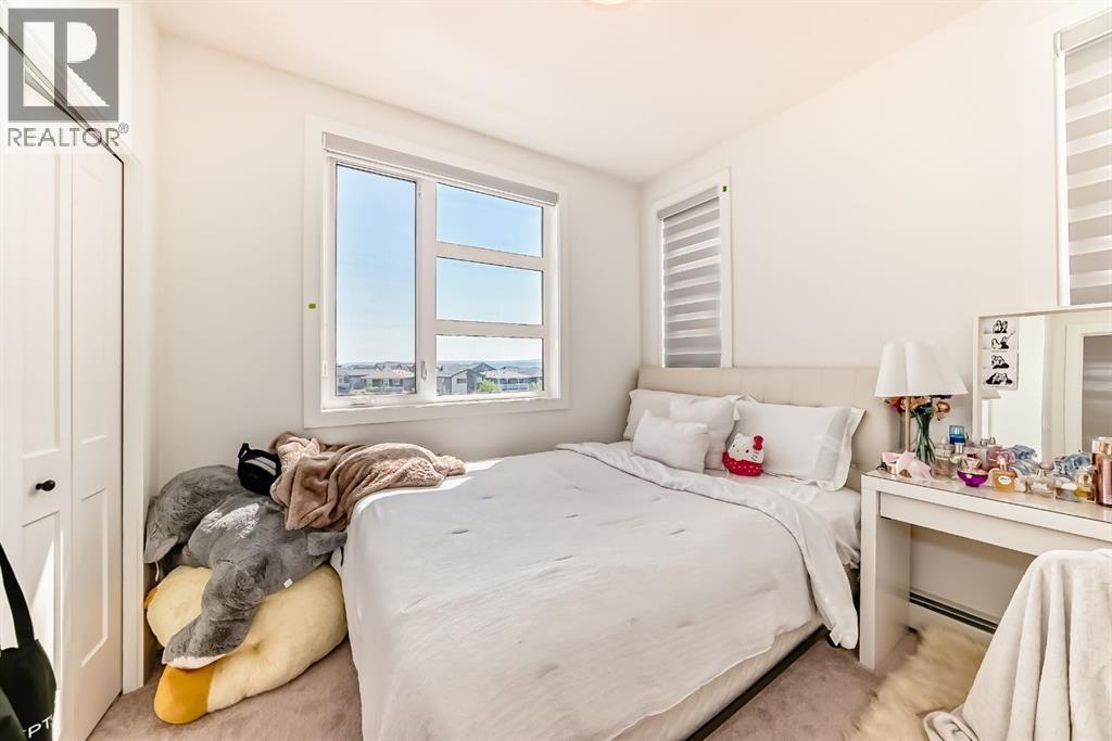 Bright west facing corner unit in Livingston, now attractively priced at $424,888. This beautifully designed 2 bedroom, 2 bathroom condo is located on the 3rd floor and offers an exceptional blend of style, comfort, and natural light.Step inside to a modern open concept layout that seamlessly connects the kitchen, dining, and living areas, creating a welcoming space for both everyday living and entertaining. The kitchen features sleek cabinetry, quartz countertops, stainless steel appliances, and a stylish backsplash.The spacious living room leads directly to the west facing balcony where you can relax and enjoy beautiful Calgary sunsets.The primary bedroom features a walk in closet, and a spa inspired ensuite with dual vanities and a glass stand up shower. The second bedroom sits conveniently next to the full main bathroom, making it ideal for guests, a home office, or a flex space.Additional features include air conditioning, luxury vinyl plank flooring, titled underground parking, and a secure storage unit.Located in the vibrant community of Livingston, residents enjoy access to parks, walking paths, and the impressive Livingston Hub with year round amenities.Now offered at $424,888, a number considered lucky and prosperous in many cultures, making this an exciting opportunity to own in one of Calgary’s fastest growing communities. Recently refreshed and priced to attract attention. Book your showing today. (id:6769)