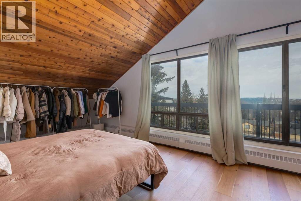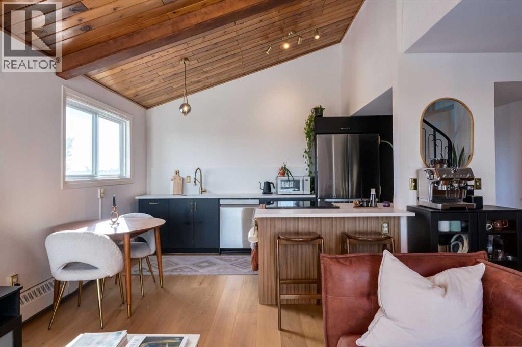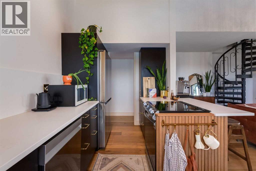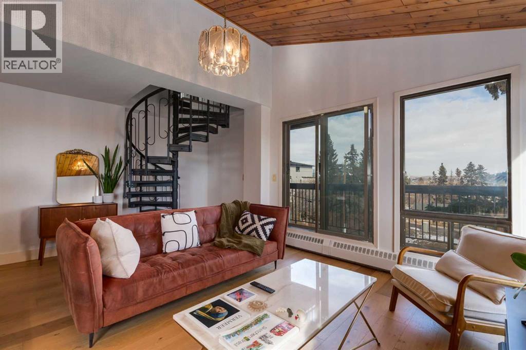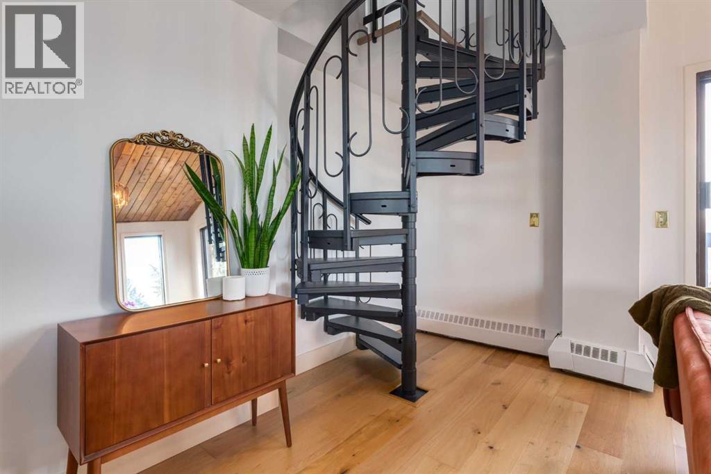 Rare loft-style two-storey condo with incredible downtown skyline views in Knob Hill Estates. Located in the heart of Bankview, just two blocks from 17th Ave SW, this bright and unique home offers a true inner-city lifestyle.The main level features brand new engineered hardwood flooring, tall slanted ceilings, and a bright open layout. The fully renovated kitchen includes stainless steel Samsung appliances and opens to the spacious living and dining area and access to a private balcony with city views.Two bedrooms and a beautifully renovated bathroom with Italian marble complete the main floor. A dramatic spiral staircase leads to the upper loft,with a wood-burning fireplace—perfect as a family room, office, or studio—with access to a second balcony overlooking downtown.Includes 2 underground heated parking stalls, storage, in-suite laundry, and a pet-friendly building. Minutes to downtown, Marda Loop, parks, and transit. (id:6769)
