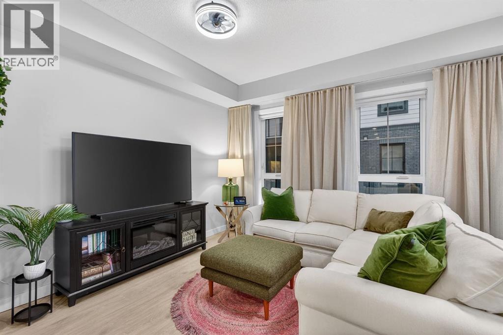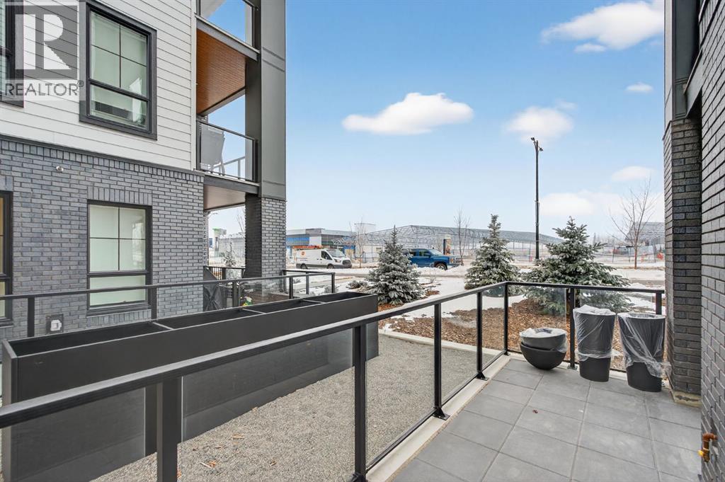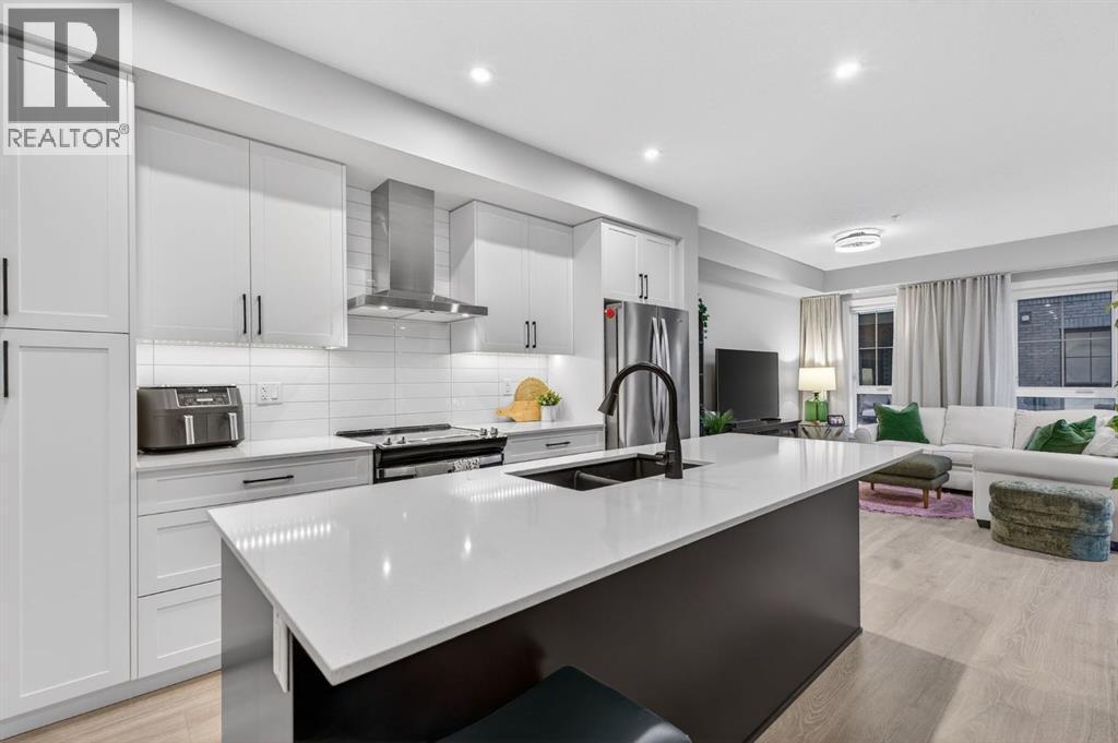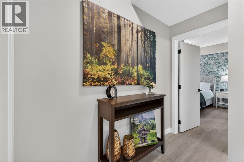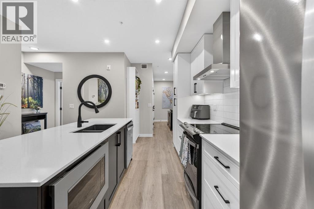 Welcome to this upgrade packed main floor 2 bedroom, 2 bathroom corner condo in the desirable Lawrie Park building in Wedderburn, Okotoks. Partner’s biggest floor model coming in over 1000sqft. This bright home with plenty of windows, features an open concept layout with a modern white kitchen, quartz countertops, large island, and durable upgraded laminate flooring throughout the main living space. The spacious primary bedroom includes a full ensuite and generous closet space with built ins, while the second bedroom is perfect for guests or a home office. Enjoy in suite laundry, air conditioning, and a large wrap around porch, great for pets, and you are just across the street from the dog park. And the property offers $8k worth of track curtains throughout. This pet-friendly building has a heated underground titled parking stall, an assigned storage locker, and low condo fees. Conveniently located close to walking paths, all the amenities you need and easy access to Calgary. Move in ready and maintenance free living at its best! Call your favourite realtor to book a showing today. (id:6769)