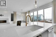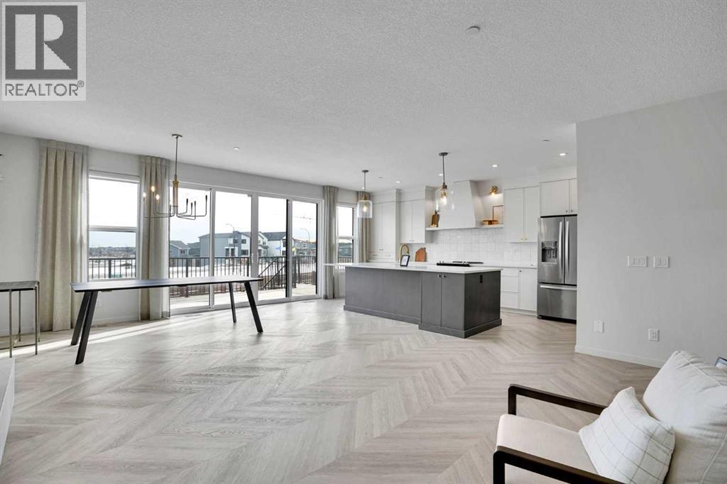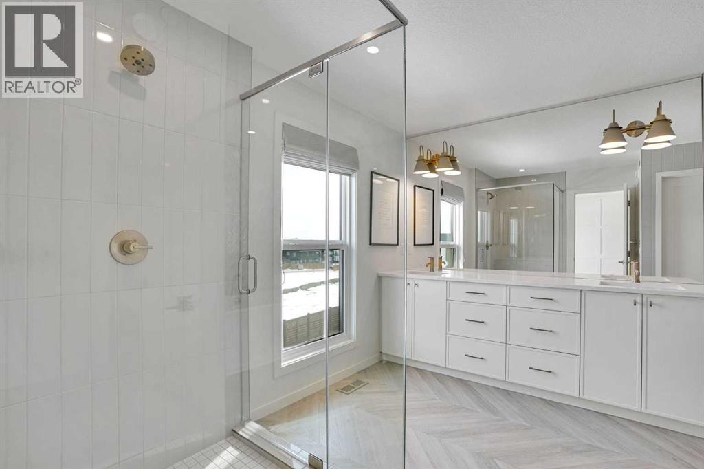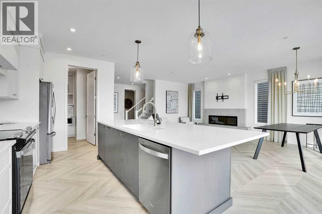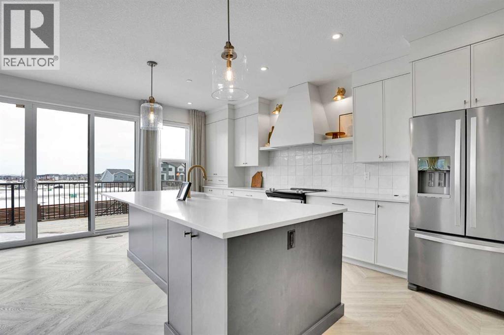 Nestled in the vibrant and family-friendly community of Livingston, this stunning former show home built by Cedarglen Homes has never been lived in and showcases exceptional craftsmanship, high-end upgrades, and thoughtful design throughout. Step inside to discover a bright open-concept main floor featuring soaring 8’ interior doors, luxury vinyl plank flooring, and elegant finishes that create a warm yet sophisticated atmosphere. Huge windows throughout the open-concept living space bring in an abundance of natural sunlight, creating a bright and welcoming environment. The inviting living room features a beautiful vertical shiplap feature wall with a tiled electric fireplace, blending modern style with cozy comfort. The chef-inspired kitchen is both functional and impressive with quartz countertops, two-tone cabinetry, a large central island, and in addition to the main kitchen, there is a separate spice kitchen that provides extra prep and cooking space. The dining nook opens onto an oversized deck, perfect for summer BBQs, entertaining guests, or relaxing outdoors. A main floor bedroom and full bathroom provide flexibility for guests, a home office, or multi-generational living. Upstairs, the primary retreat offers a spa-inspired ensuite with a custom tiled shower, soaker tub with tile ledges, dual sinks, quartz countertops, and a spacious walk-in closet, while three additional generously sized bedrooms provide plenty of space for family or guests. The upper level also includes a convenient laundry room and a beautiful, cozy bonus room ideal for relaxing or spending time with family. Every detail of this home reflects quality and thoughtful upgrades, including upgraded lighting, designer hardware, and an installed security system. Outside, enjoy the completed oversized deck while taking in the peaceful surroundings of Livingston. Residents also enjoy access to the impressive Livingston Hub, a state-of-the-art facility featuring a skating rink, splash park, gymnas ium, tennis courts, and event spaces, along with numerous parks, playgrounds, and pathways throughout the neighbourhood, with convenient access to Stoney Trail and Deerfoot Trail for easy commuting. Move-in ready and never lived in, this exceptional show home offers the perfect combination of designer elegance, everyday functionality, and outstanding value. (id:6769)