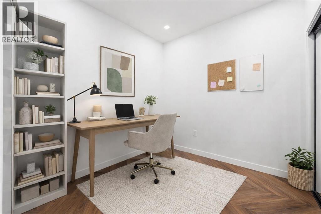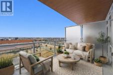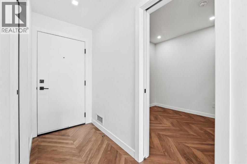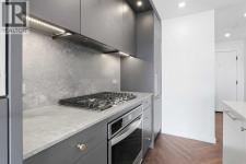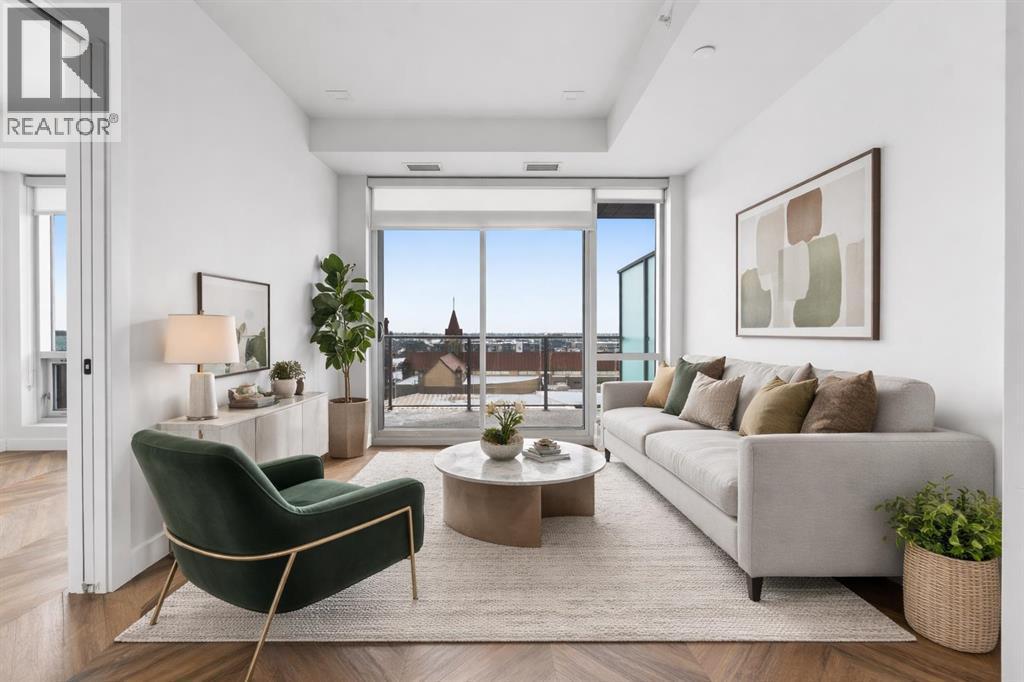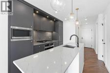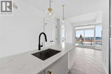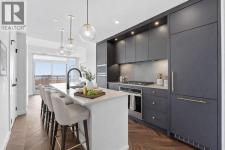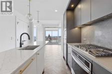 Welcome to Gateway by TRUMAN, perfectly positioned in Calgary’s vibrant, master-planned West District. Built with concrete construction, this residence delivers refined design, elevated finishes, and effortless urban living. This 2-bedroom, 2-bathroom condo with titled underground parking showcases chevron wide-plank flooring, designer lighting, and smooth flat-painted ceilings for a clean, contemporary aesthetic. Expansive floor-to-ceiling windows flood the interior with natural light and frame impressive city views, while central air conditioning provides year-round comfort. The chef-inspired kitchen is both striking and functional, featuring matte custom cabinetry, brushed-gold accents, quartz countertops and full backsplash, under-cabinet lighting, and a generous eating bar. Premium appliances include a gas cooktop, wall oven, 36” Fisher & Paykel integrated refrigerator, panelled dishwasher, and statement hood fan. Open-concept living and dining areas extend seamlessly to a private balcony. The primary suite offers a walk-in closet and spa-inspired ensuite complete with quartz counters, mosaic tile detailing, and a glass-enclosed shower. The second bedroom provides versatility as a guest room or home office, with convenient access to a stylish four-piece bath. Additional highlights include in-suite laundry, excellent storage, and secure titled underground parking. Residents enjoy upscale amenities including a rooftop patio, owner’s lounge, concierge service, bike storage, EV charging stations, and visitor parking. Surrounded by parks, pathways, boutique shopping, cafés, and dining, this is elevated urban living in one of Calgary’s most desirable communities. (id:6769)
