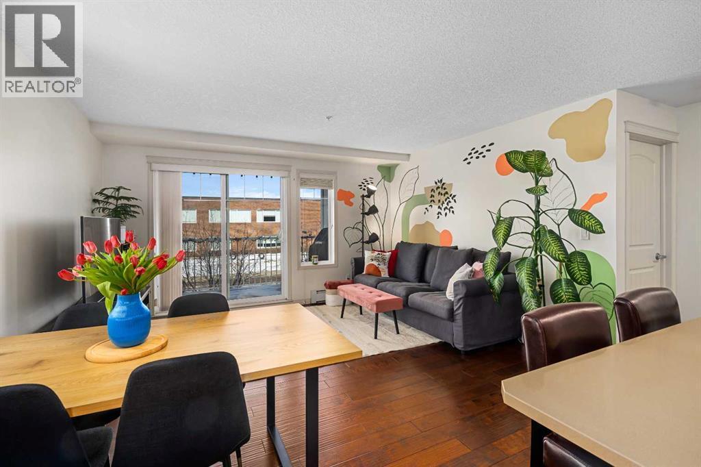 Welcome to this beautifully maintained two-bedroom, two-bathroom corner unit with a dedicated office/flex room in the sought-after community of Cranston. Located just steps from grocery stores, neighbourhood shops, and the Cranston Community Centre, this home offers exceptional convenience and lifestyle.The bright open-concept layout is filled with natural light thanks to the corner-unit positioning and large windows. Rich hardwood flooring flows through the main living areas, creating a warm and inviting space for everyday living and entertaining.The kitchen features quartz countertops, a large island with breakfast bar, plenty of cabinetry, and generous counter space. The adjacent dining and living areas open to a private balcony with a gas line for BBQ, perfect for relaxing or hosting guests.One of the standout features of this home is the smart and functional layout. The spacious primary bedroom includes a walk-through closet and private 3-piece ensuite, while the second bedroom is located on the opposite side of the unit next to the 4-piece bathroom, offering ideal privacy for guests or roommates.A separate office/den provides the perfect space for working from home, hobbies, or a reading room.Additional highlights include in-suite laundry, heated underground parking with a storage locker, and a well-managed condo complex. Enjoy quick access to schools, shopping, Deerfoot Trail, Stoney Trail, and Fish Creek Park.A fantastic opportunity for first-time buyers, professionals working from home, downsizers, or investors. (id:6769)