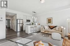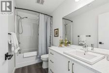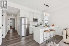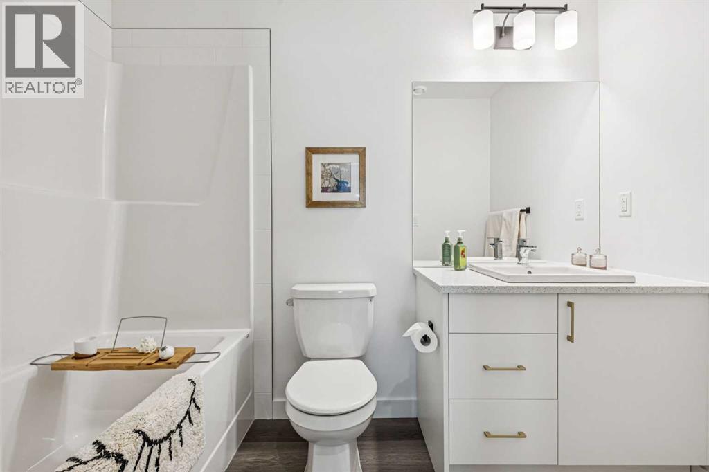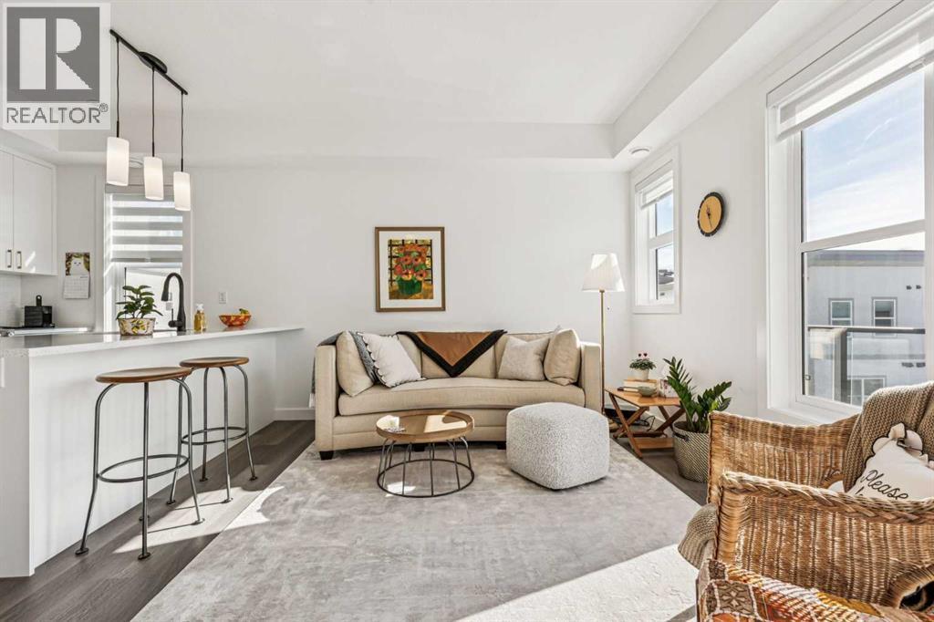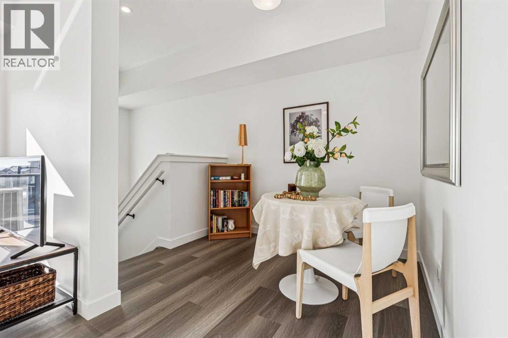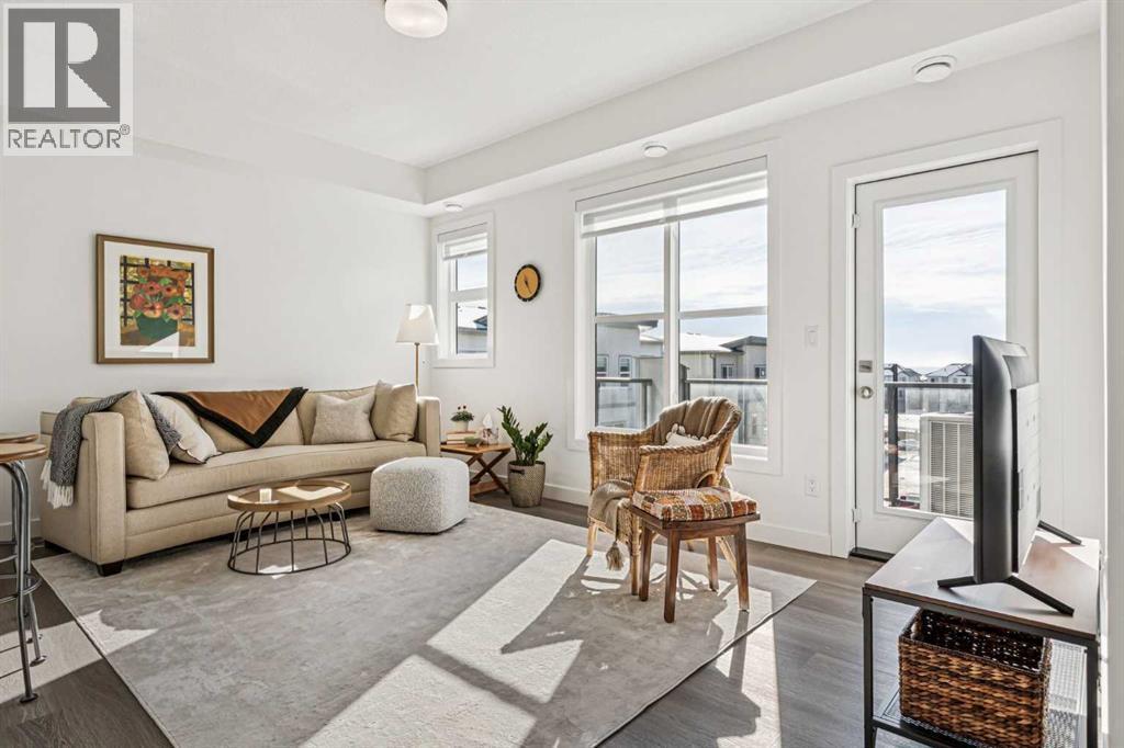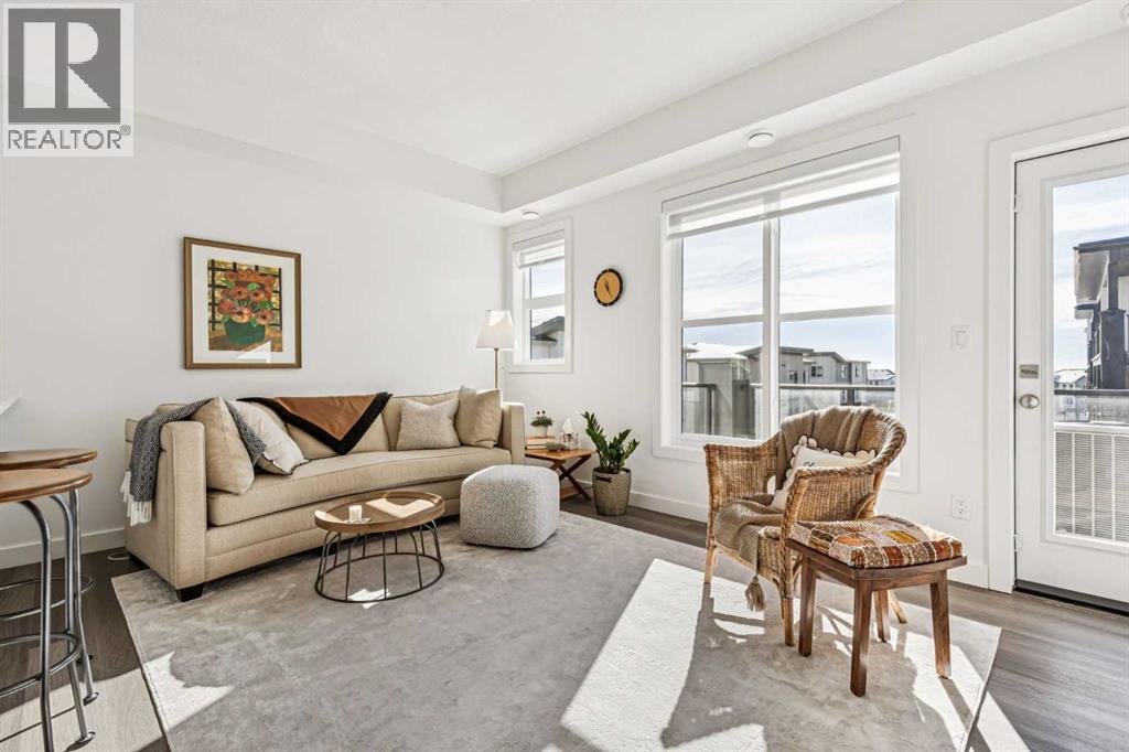 Discover Elkwood in Aspen Springs, located in one of Calgary’s most desirable southwest communities. Positioned at the end of a quiet street, this new stacked townhome enjoys some of the most open sightlines in the complex along with a sunny south-facing exposure, allowing natural light to pour in throughout the day. Thoughtful upgrades include central air conditioning and window coverings, making this home truly move-in ready. The home is also conveniently located close to guest parking, making it easy for visitors.Situated on the top floor, this modern home features 2 spacious bedrooms and 2 full bathrooms within a well-designed open-concept layout. 9-foot ceilings, expansive windows, and wide-plank luxury vinyl flooring create a bright and inviting atmosphere throughout the main living areas.The designer kitchen is both stylish and functional, featuring quartz countertops, soft-close cabinetry, a tiled backsplash, stainless steel appliances, a built-in microwave hood fan, and an upgraded convection oven. An east-facing kitchen window welcomes the morning sun, adding even more natural light to the space. The thoughtful layout offers both bar seating at the kitchen island and a dedicated dining area, making it ideal for everyday living and effortless entertaining.Convenience continues with a main floor laundry room featuring a front-load washer and dryer along with generous storage space. The lower level provides additional storage and a versatile flex room, perfect for a home office, workout space, or hobby area, plus private direct access to your attached garage—large enough to accommodate a Ford F-150 truck, a rare and valuable feature for townhome living.Ideally located just minutes from the shops and restaurants of Aspen Landing Shopping Centre, and easy C-Train access, along with nearby walking paths, schools, and beautiful green spaces, this home offers the perfect balance of style, comfort, and convenience.Whether you’re a first-time buyer, invest or, or seeking a low-maintenance lifestyle, this exceptional home truly checks all the boxes. (id:6769)