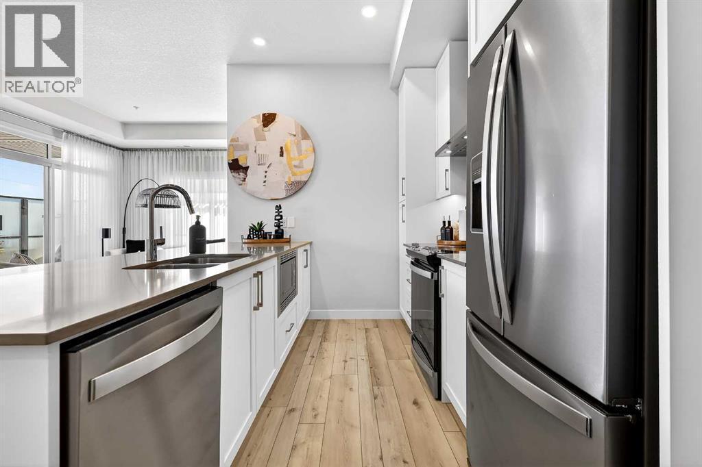 ** OPEN HOUSE EVERY SATURDAY FROM 2-4PM ** Check out this amazing main floor, former showhome, corner unit located in Les Jardins by Jayman BUILT next to Quarry Park! As you step into this highly sought after main floor suite, you will be welcomed by the soaring ceiling heights (almost 10 FEET!), exclusive only to main and top floor units, and the foyer of your dreams with storage and space to hide all jackets and shoes of yours and your guests! As you walk around the corner you are greeted by the beautifully maintained dining room, living space and kitchen. With UPGRADED appliances like the Whirlpool Range, Fridge, Hood Fan and dishwasher, you’ll be sure to enjoy family dinners from the comfort of your new home. Appreciate the ease of the extra-large peninsula for extra dining along side of the designated space for a 6-person dining table. Need more room? Bask in the SOUTH FACING windows in your new living area and enjoy easy access to the 36 ft WIDE, covered, wrap around patio that makes the summer months something to look forward to! Bring yourself back to relaxation by visiting the primary bedroom that includes an ensuite with a stand-up shower and the walk through his and hers closets with sliding doors to keep organizing simple. The secondary bedroom and 4 pc bathroom are perfect for any guests or family member needing a place to stay by offering space and privacy. This amazing unit includes the Washer and Dryer, Central Air Conditioning, high end fixtures and Smart Home Tech (Kasa light switches, Weiser Smart Lock, Ring Floodlight located above the exterior patio door and the Ecobee Smart Thermostat!!) Within the common areas of the building you will find countless amenities that will peak your interest in this fascinating community! With the State-Of-The Art FITNESS CENTRE , Bike Storage room, CCTV cameras, seating areas throughout, a private dog run only for residence, and last but not least, the 2 ACRE PARK inspired by the Gardens of France, you will step into this community and IMMEDITALY feel at home! Neighboring both Quarry park and Douglas Glen, there is an endless array of shopping, restaurants, schools, daycares as well as bikes paths and walking trails to Calgary's very own Bow River and Fish Creek Provincial Park to help feed any outdoor cravings you may have. If there is anything out of reach from the community, fear not, you have access to both Deerfoot Trail and Glenmore trail within a 5 min drive - making your commute downtown only 20 minutes! Enjoy the condo life in luxury, book a showing! (id:6769)