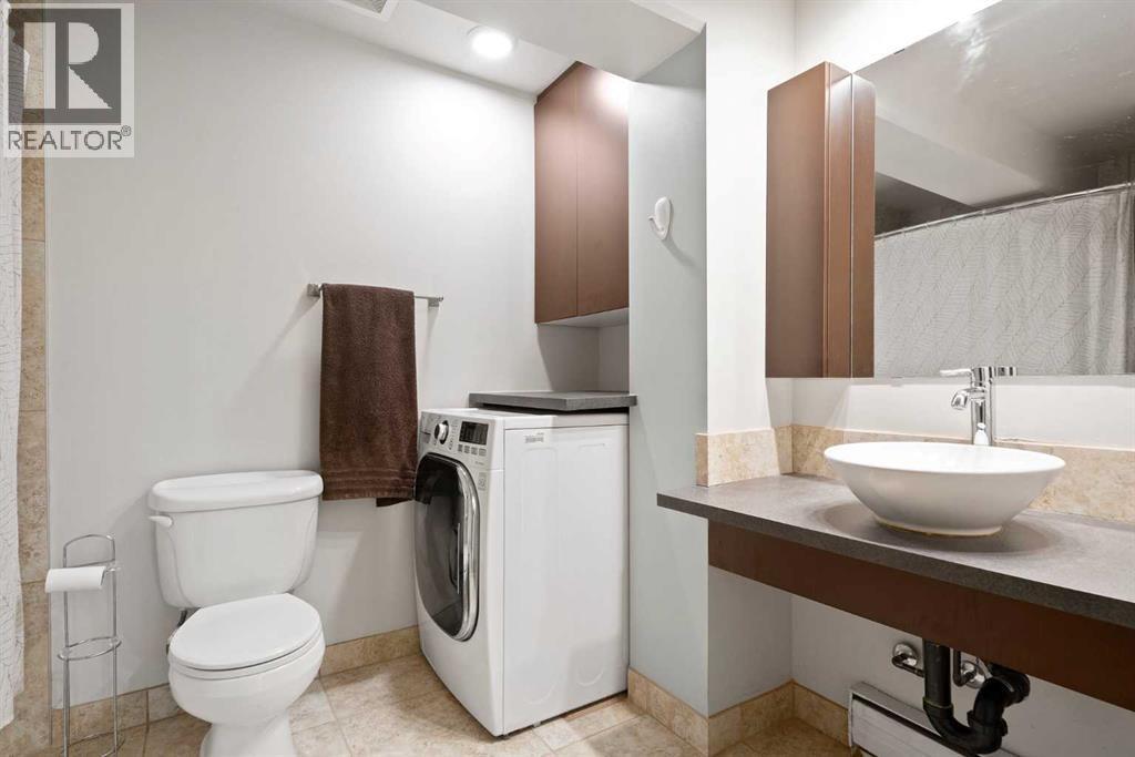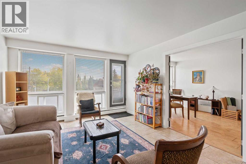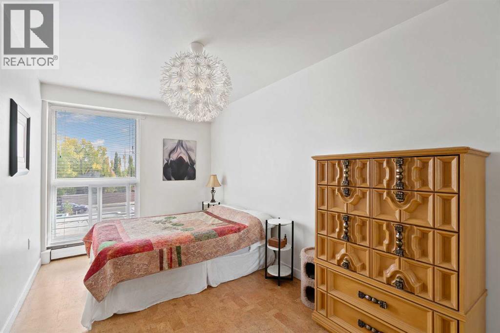Welcome to this spacious 2-bedroom, 1-bath unit that offers over 860 sq. ft. of thoughtfully designed living space in one of Calgary’s most vibrant inner-city communities. Located on the top floor of a solid concrete building, this corner unit is filled with natural light from multiple exposures and enjoys downtown views from its northeast-facing balcony. Inside, the open-concept kitchen is both stylish and functional, featuring stainless steel appliances including a new Miele dishwasher, espresso cabinetry, modern hardware, soft-close drawers, a breakfast bar, and plenty of cabinet and counter space. The kitchen flows seamlessly into the dining area and living room, where large windows brighten the space. Tile flooring flows throughout for easy upkeep, and the bedrooms are lined with warm cork. From the living room, French doors open to the second bedroom that can be used as a home office, complete with cork flooring and a closet. The spacious primary bedroom offers a large closet and sits next to 4-piece bathroom with soaker tub and a full-size LG washer/dryer combo, adding everyday convenience. There’s also a deep in-unit storage closet, perfect for keeping your belongings organized. Additional shared storage is available in the building. This pet-friendly condo welcomes your furry friends (no size restrictions, board approval required), and nearby off-leash dog parks make it easy to get outside and explore. Covered parking is included, with the option for additional permit parking out front.Located in Bankview, a hidden gem just minutes from downtown, this home is surrounded by unique streets and plenty of parks. Local cafés, restaurants, and shops are all within walking distance—plus a Starbucks just steps from your door. You’re also conveniently close to both 17th Ave SW and Marda Loop, giving you easy access to everything the city has to offer. This condo combines thoughtful design, modern updates, offering a comfortable and vibrant space to call home in the heart of Calgary. Book your showing today. (id:6769)