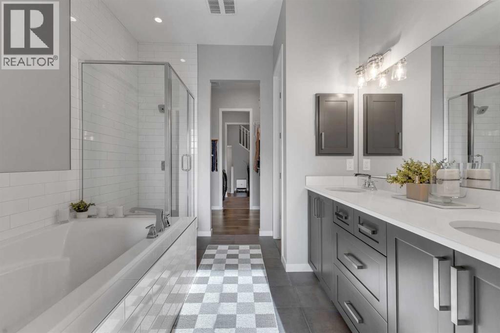 Welcome to this stunning luxury bungalow with an upper loft nestled in the heart of the highly sought-after Riverstone community in Cranston. Surrounded by nature and located along the edge of the Bow River, Riverstone offers breathtaking scenery, tranquil walking paths, and an unmatched sense of peaceful living. Perfectly positioned on a corner lot backing directly onto a pathway, this exceptional home offers the rare combination of refined indoor living and serene outdoor surroundings. With over 2,900 sq ft of developed living space this thoughtfully designed home offers a total of five bedrooms, making it ideal for both growing families and those looking to downsize. Step inside to an inviting open-concept layout highlighted by wide-plank flooring, soaring 10-foot ceilings, and elegant 8-foot doors throughout the main level. Natural light floods every corner through the array of additional east facing windows. The expanded gourmet kitchen features a sprawling island, beautiful quartz counters, upgraded stainless steel appliances, a beverage fridge, large pantry, and custom ceiling height cabinets - perfectly designed for those who like to cook and entertain. The dining area easily accommodates larger dinner gatherings and flows seamlessly into the spacious great room with views of the perfectly manicured back yard. The primary suite is a true sanctuary, complete with a luxurious ensuite that features dual vanities, a fully tiled walk-in shower, a soaker tub, and a walk-through closet connecting to your main floor laundry room. This home also features a rare and highly sought-after upper bedroom/loft with a walk-in closet, offering exceptional flexibility for use, including as an office space. A stylish 2-piece powder room and large mudroom complete the main level. The fully finished lower level expands the home’s living space with a large open recreation and family area, perfect for movie nights or entertaining. In-floor heating throughout ensures year-round comf ort, while three additional bedrooms and a full four-piece bathroom offer flexible options for guests, teens, or extended family. The backyard is a professional masterpiece featuring a large tiered deck, a patio, shed, and a cozy firepit area. An abundance of trees, shrubs, and vibrant perennials are perfectly arranged to create both beauty and a serene, private space for relaxation. This home truly reflects pride of ownership; every feature is thoughtfully designed and maintained to the highest standards. Additional upgrades including central A/C, exterior security cameras, extended garage, 36" bathroom vanities, and high-end lighting, enhance this home's beauty. (id:6769)
