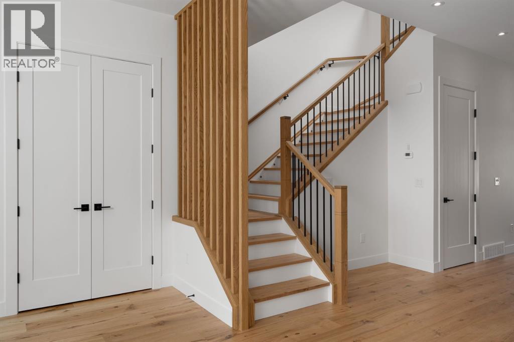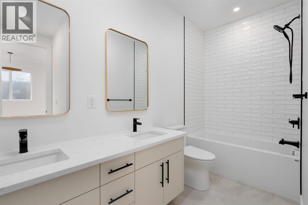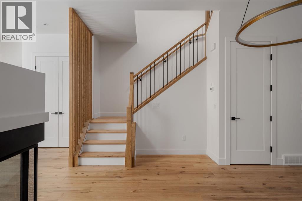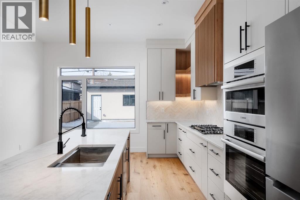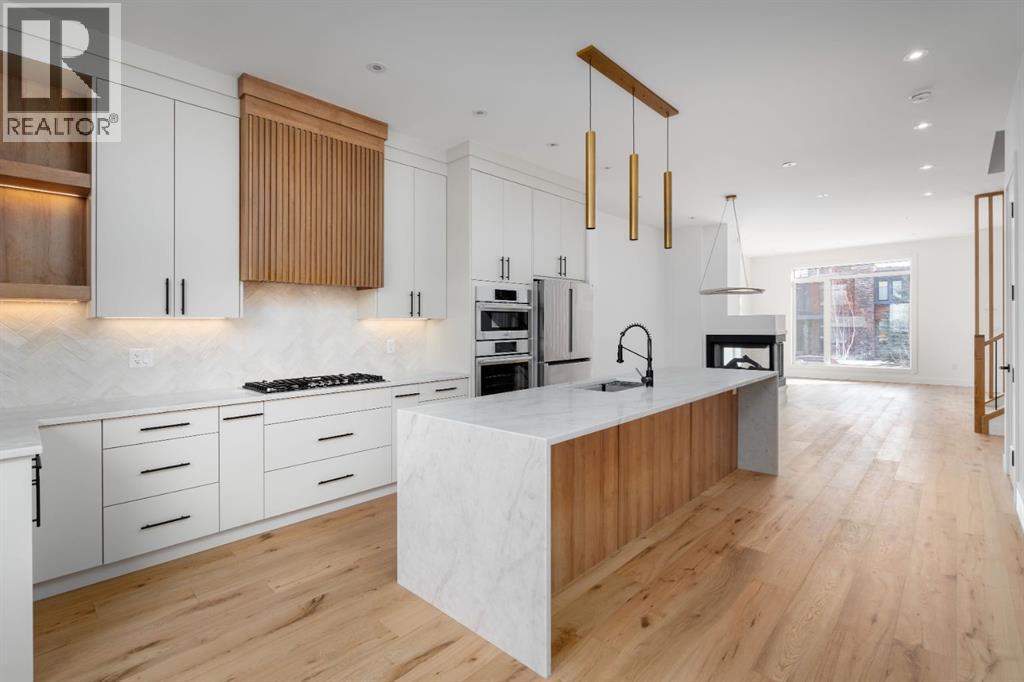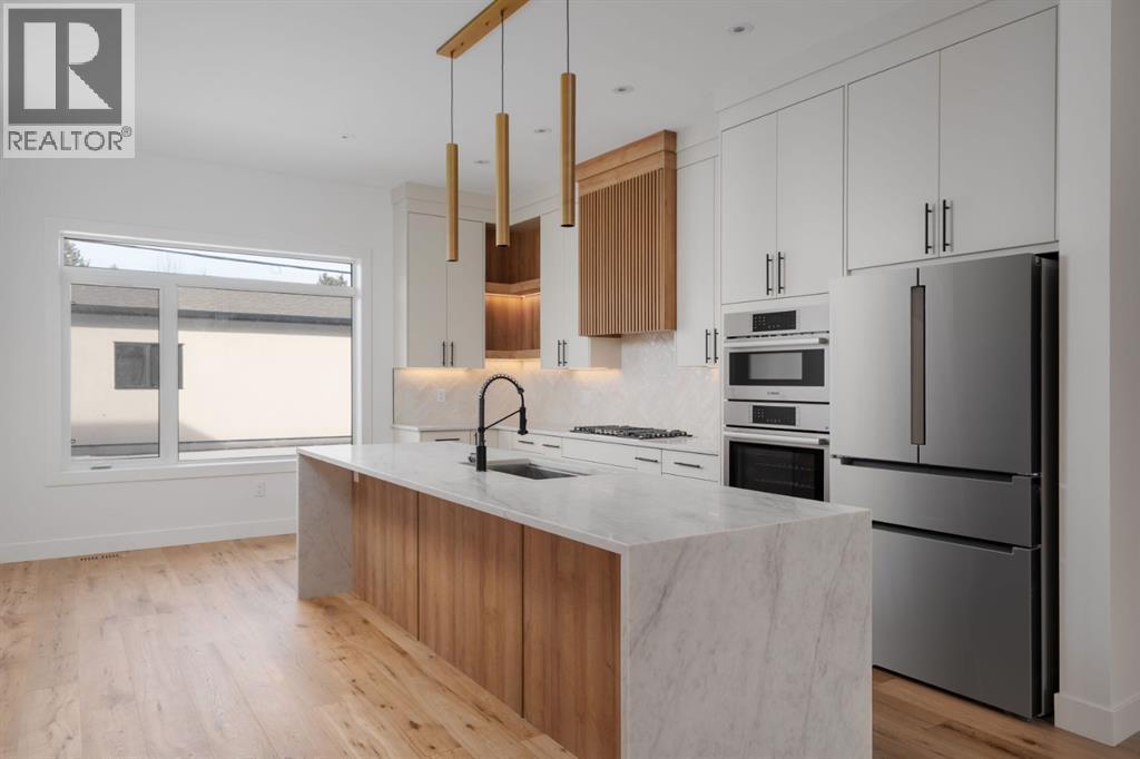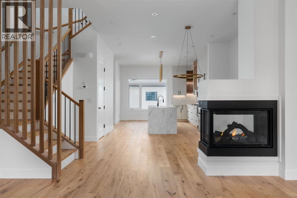 | Show Suite Open House Saturday March 14th and Sunday March 15th from 12:00pm-3:30pm | Welcome to The Killarney Collection in SW Calgary—thoughtfully crafted on a quiet street, this fully upgraded duplex infill offers a refined balance of scale, texture, and modern comfort. From the moment you arrive, the home makes a striking first impression with its sleek, contemporary exterior, pairing oversized triple-pane windows for abundant natural light with warm natural tones of true brick detailing and stucco accenting stands out. Inside, 10-foot main floor ceilings create a grand sense of arrival, setting the tone for the interior designer–curated colour palette carried throughout the home. Every detail has been intentionally explored, with the heart of the main floor anchored by a chef-inspired gourmet kitchen. Featuring a premium Bosch appliance package, fully custom-painted cabinetry, and an oversized waterfall granite island, the space effortlessly blends luxury with everyday functionality. A dedicated central dining off the kitchen offers a warm setting for gatherings, while the front living room provides a more intimate retreat, both areas are anchored by the full feature-wall gas fireplace—perfect for evenings spent unwinding. Thoughtful storage solutions are seamlessly integrated, including built-ins at the entry and a fully custom mudroom at the rear, ensuring every inch of space is maximized. Ascending to the upper level, subtle design moments continue to impress, with a full wood feature wall, custom stair lighting, and luxury wide-plank hardwood flooring flowing continuously throughout both the main and upper levels for a seamless transition.The oversized primary bedroom is a true sanctuary, showcasing a vaulted and peaked ceiling design with expansive windows that welcome morning light. The spa-inspired ensuite features a dual vanity, an expansive full-tile shower, and a calming, private retreat. Two additional bedrooms offer generous proportions, each co mplete with custom closet built-ins. The upper-level laundry room maintains the home’s commitment to efficiency and design, offering full cabinetry, a folding counter, side-by-side washer and dryer, and a laundry sink. A versatile work-from-home alcove completes the upper floor, easily functioning as a den or secondary living space.The lower level further extends the home’s flexibility with an oversized 2-bedroom, 1-bath legal suite (900+SQFT), centered around a spacious open kitchen—ideal for rental income, guests, or multi-generational living. A separate full laundry room, understair storage, and built-ins throughout each closet to ensure the same level of thoughtful design continues below.Perfectly positioned close to inner-city Calgary, recreation centres, shopping, and public transit, this Killarney residence offers a timeless blend of form and function—designed to live beautifully today and adapt effortlessly for tomorrow. (id:6769)
