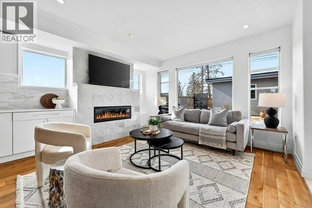 Welcome to this exceptional luxury infill in the desirable inner-city community of Glenbrook, offering over 3,000 sq ft of developed living space with 4 bedrooms and 5 bathrooms on a large corner lot with sunny south and west backyard exposure that fills the home with natural light throughout the day. The open-concept main floor is designed for both everyday living and entertaining. The stunning chef’s kitchen features high-end stainless steel appliances including a gas cooktop, extensive contemporary cabinetry, a marble backsplash, and a massive quartz island with waterfall edge and double-thick edge detail. The bright living room overlooks the backyard and is anchored by a sleek linear fireplace, creating a warm and inviting space. Walnut hardwood flooring runs throughout nearly the entire home, including the upper levels and basement living areas. The second floor offers three bedrooms, a full bathroom, convenient laundry, and mountain views. The spacious primary suite features a walk-in closet with built-ins and a spa-inspired ensuite with heated floors, double vanity, glass shower, and deep soaker tub beside a large window that fills the room with natural light. The entire third floor is a standout entertaining space, offering a bright and versatile lounge area complete with a wet bar, beverage fridge, and 2-piece bathroom. Step outside to the private balcony with gas hookup, perfect for relaxing or entertaining. The professionally developed basement includes a large recreation area with built-in wet bar, a fourth bedroom, and a full bathroom, along with in-floor slab heating for year-round comfort. Additional highlights include a double detached garage with 220V outlet for EV charging. Ideally located close to parks, schools, restaurants, and shopping at Westhills and Signal Hill Centre, with quick access to Richmond Road and Sarcee Trail and approximately an 8-minute commute to downtown Calgary. (id:6769)