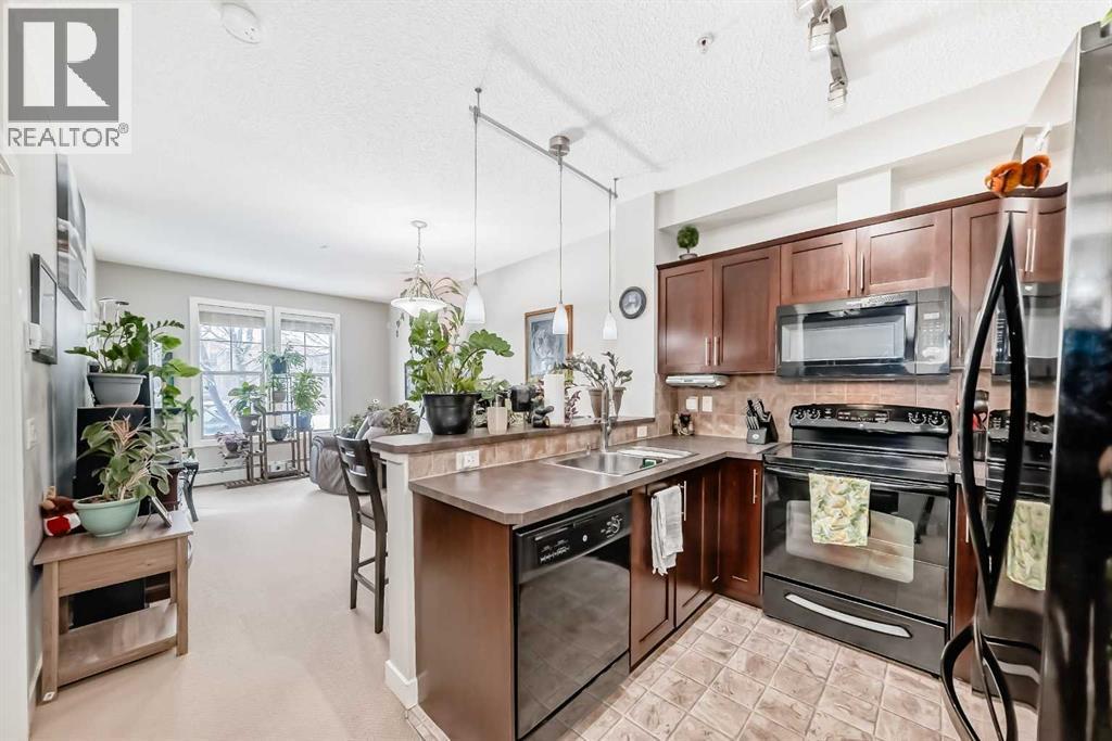 Welcome to this inviting southwest facing ground floor apartment in the sought-after community of Sunset Ridge. Offering a functional and comfortable layout, this home features updated appliances, a spacious primary bedroom with a walk-in closet, an office area, and the convenience of an in-suite laundry room. Step outside to your private southwest-facing patio, the perfect place to relax and enjoy beautiful mountain views, complete with a BBQ gas line for easy outdoor grilling and entertaining. There is a titled parking stall and a dedicated storage unit in the underground heated parking garage. Residents have access to excellent building amenities including a fitness centre, secure bike storage, and a guest suite available to rent for visiting friends and family. Ideally located just steps from a convenient commercial plaza featuring a gas station, convenience store, restaurants, bakery, pharmacy, liquor store, and hair salon, making everyday errands effortless. Surrounded by pathways, parks, and stunning Rocky Mountain views, this home offers comfortable, low-maintenance living. (id:6769)