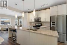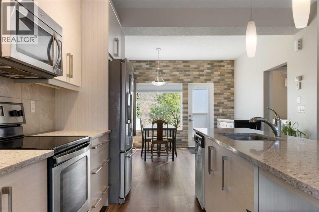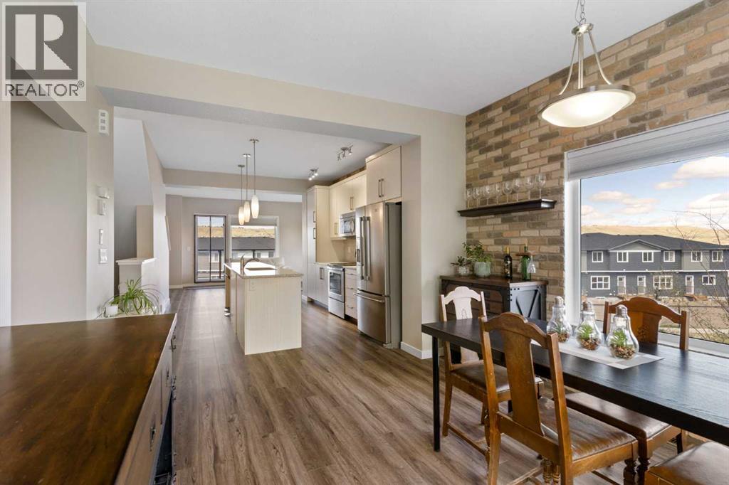 Welcome to this bright and stylish 3-storey corner townhouse in The Rise, backing onto green space for added privacy and natural light. The open-concept main level features a modern kitchen with central island, spacious living and dining areas, brick accent wall, main floor laundry, and A/C rough-in. Enjoy both a front balcony and private rear outdoor space, perfect for relaxing or entertaining.Upstairs offers 3 bedrooms and 2.5 bathrooms, creating one of the most functional layouts in the complex, with elevated views toward Cochrane. The oversized tandem garage comfortably fits two vehicles with extra room for storage.Ideally located close to parks, schools, pathways, and amenities, with quick access to downtown Cochrane, the Jack Tennant Memorial Bridge, Highway 1, and the mountains. (id:6769)