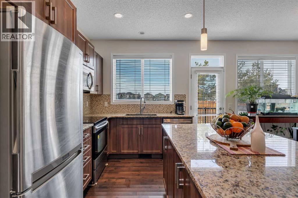 BACKING GREEN SPACE!! Welcome to this exceptional family home in the highly sought-after lake community of Auburn Bay. Ideally located on a quiet, family-friendly street, this beautifully finished home offers over 2,250 sq. ft. of thoughtfully designed living space and is just steps from schools, parks, restaurants, the lake, and all the amenities that make Auburn Bay such a vibrant place to live. Step inside to a spacious front entryway that leads into a bright open-concept main floor featuring rich hardwood flooring throughout. The main level also includes a generous dining area and a timeless kitchen designed for both everyday living and entertaining, complete with granite countertops, stainless steel appliances, and a large island with breakfast bar seating. Upstairs you’ll find a functional three-bedroom layout plus a large bonus room, perfect for movie nights, a play area, or a home office. The primary suite features a walk-in closet and a private 4-piece ensuite, creating a comfortable retreat at the end of the day. The fully developed basement expands the living space even further with a fourth bedroom, recreation area, 3-piece bathroom, and laundry room with ample storage. Step outside to enjoy your fully landscaped backyard, complete with a spacious deck and lush lawn — ideal for summer barbecues, entertaining guests, or relaxing with family while enjoying the peaceful green space behind. Additional highlights include central air conditioning, a single attached garage, and quick access to Stoney Trail and Deerfoot Trail, making commuting throughout Calgary easy and convenient. (id:6769)