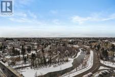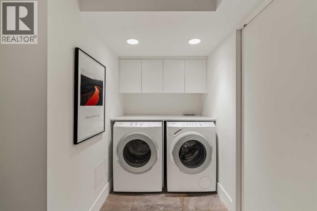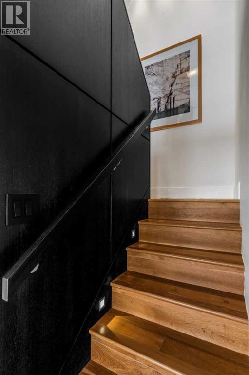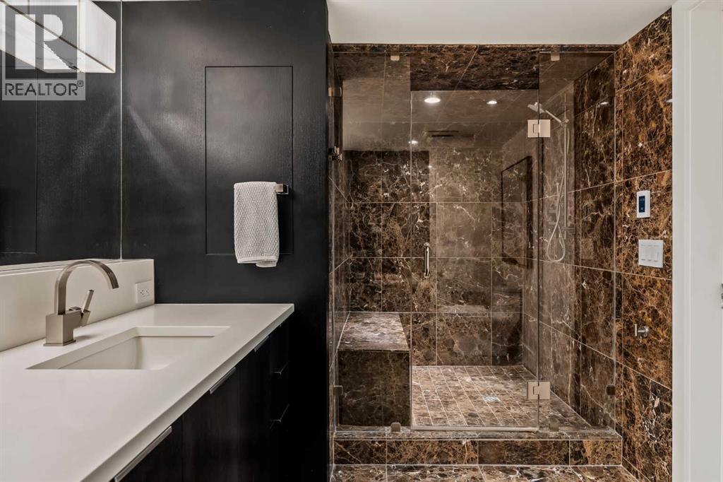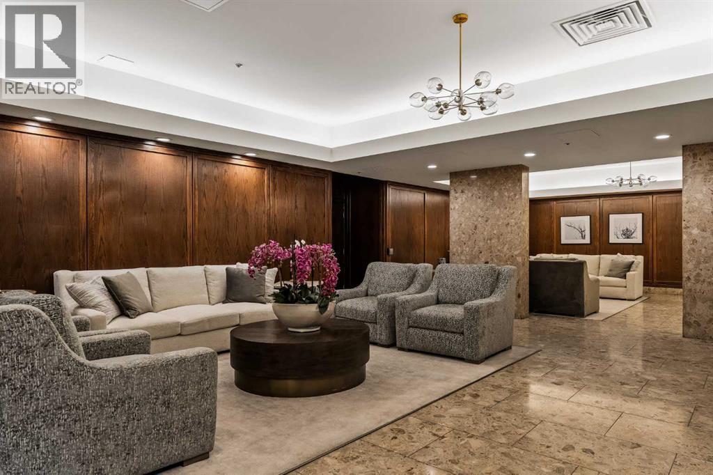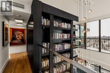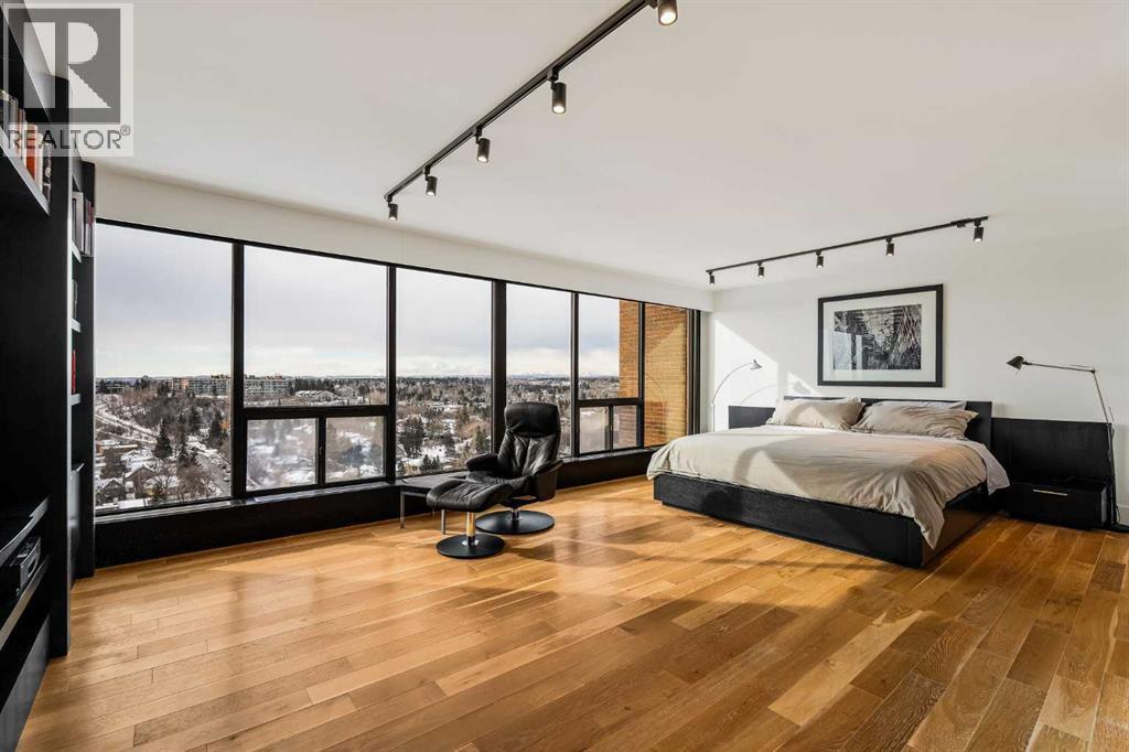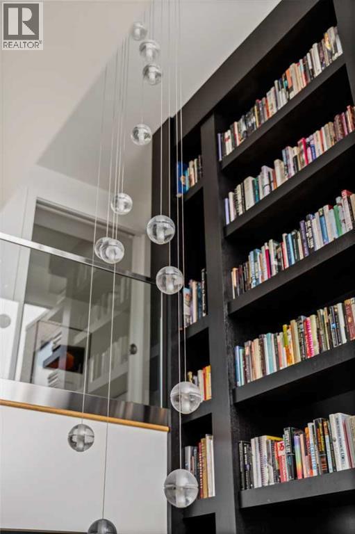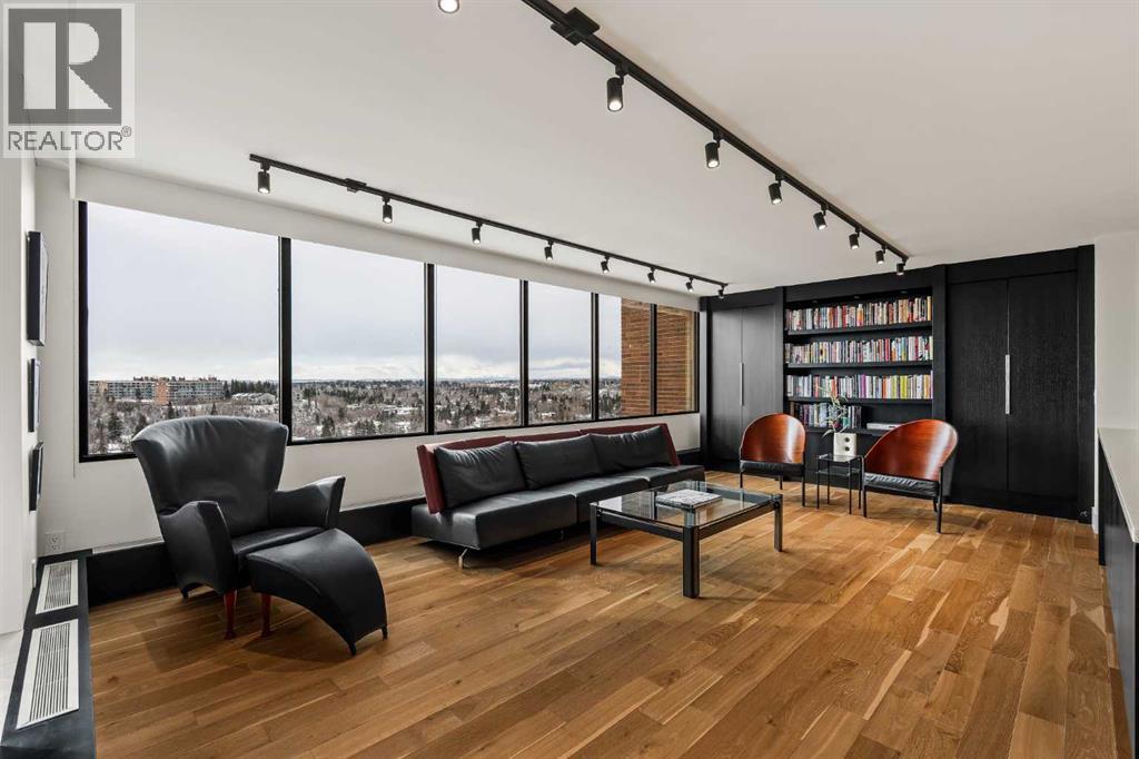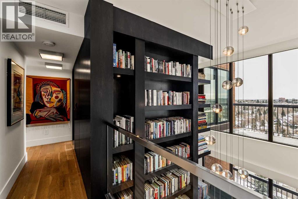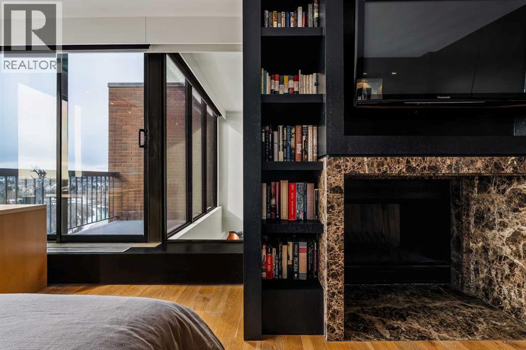 Architecturally renovated, this remarkable 2 storey penthouse delivers over 2,300 sq ft of refined living space with sweeping river valley and mountain views in the heart of Mission. Positioned within Roxboro House, one of Calgary’s most established concrete buildings, the home places river pathways, restaurants, cafés and downtown access within an easy walk while maintaining a quiet elevated setting above the city. Dramatic double height ceilings define the main living space where floor to ceiling windows frame expansive views and fill the interior with natural light throughout the day. Custom millwork and built-in library shelving introduce architectural character while a striking Bocci designer light installation creates a sculptural focal point above the living area. Marble fireplace surrounds add warmth and elegance while hardwood flooring extends throughout the home to create a cohesive and timeless finish. Entertaining flows easily between the living and dining areas where open sightlines toward the river valley form an impressive backdrop for gatherings. Quartz countertops and a full height quartz backsplash highlight the beautifully renovated kitchen where extensive custom cabinetry and a large central island support both daily routines and larger entertaining. Walk-in pantry storage keeps the space organized while built-in speaker wiring enhances the atmosphere for hosting. Adjacent bar cabinetry incorporates three wine fridges with capacity for approximately 750 bottles, creating a dedicated entertaining feature rarely found in condominium living. Upper level design introduces a flexible den retreat with its own fireplace and access to a second balcony, offering an ideal setting for a home office, lounge or private reading space overlooking the city skyline while an included Murphy bed allows the space to easily accommodate overnight guests when needed. Primary bedroom accommodations prioritize comfort and privacy through large windows, blackout blinds an d extensive custom storage solutions. Heated floors in the lavish ensuite provide everyday comfort while modern fixtures enhance the spa-inspired atmosphere. Air conditioning supports year-round comfort and upper level laundry adds everyday convenience. Two private balconies extend the living space outdoors while showcasing panoramic mountain and river views. Tandem underground parking accommodates 2 vehicles and an assigned storage unit adds valuable extra space. Roxboro House residents enjoy secure entry with front desk service along with exceptional amenities including an indoor pool, hot tub, sauna, fitness room, woodworking shop, library and billiards lounge, party room and a beautifully landscaped sky terrace with BBQ areas and outdoor gathering spaces. Mission remains one of Calgary’s most vibrant inner-city neighbourhoods where river pathways, parks, restaurants and boutique shopping create an exceptional walkable lifestyle just minutes from downtown. (id:6769)