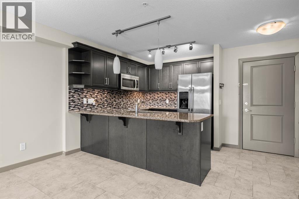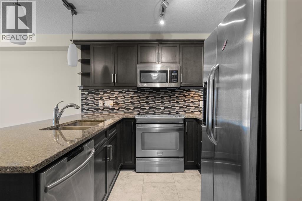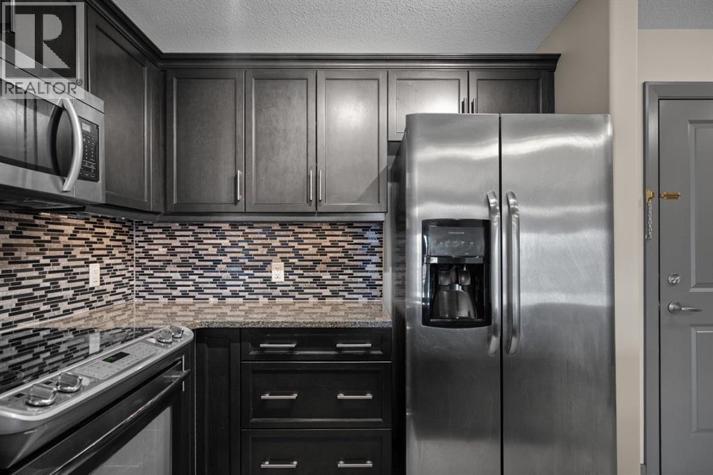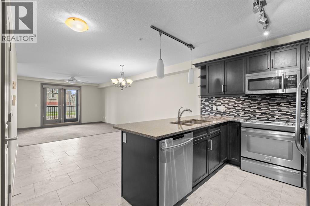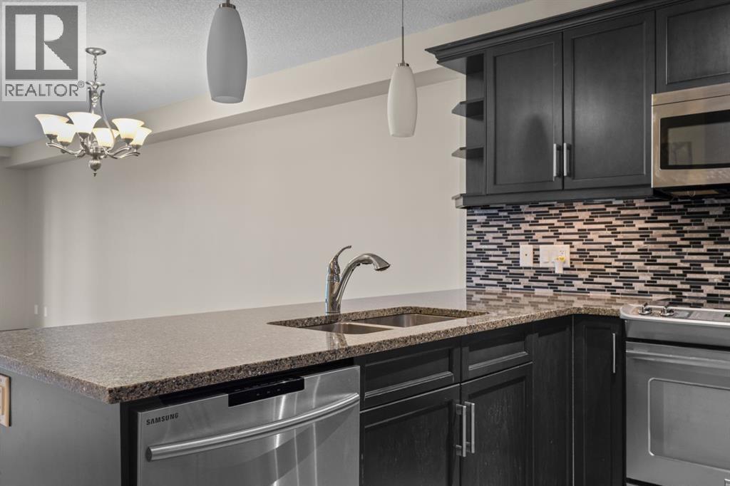 A Great Investment Property or place to call home! This Spacious Condo has an open concept floorpan with a Stylish Upgraded Kitchen over looking the huge Dinning/Living room area which is a great space to entertain Friends and Family. The Kitchen features Granite countertops, dark cabinetry with glass mosaic tile backsplash, under counter lighting, breakfast bar & upgraded stainless steel appliance package. The large open Living/Dining room area has French Patio doors to a large balcony with gas hook-up. The den is a the bright area off the Living room with a big window that makes a great office space. The Primary Bedroom features a walk-through closet and adjoins to a 3 pc bathroom. Convenient in-suite laundry and pantry. Custom window coverings including blackout blinds. Heated underground secure parking stall and a secure storage locker. Complex has Bike Storage available as well. McKenzie Towne is a great place to call home and is close to the South Campus Hospital, Shopping, Restaurants, Bike paths. 18+ Building. This freshly painted condo is ready to move in! (id:6769)